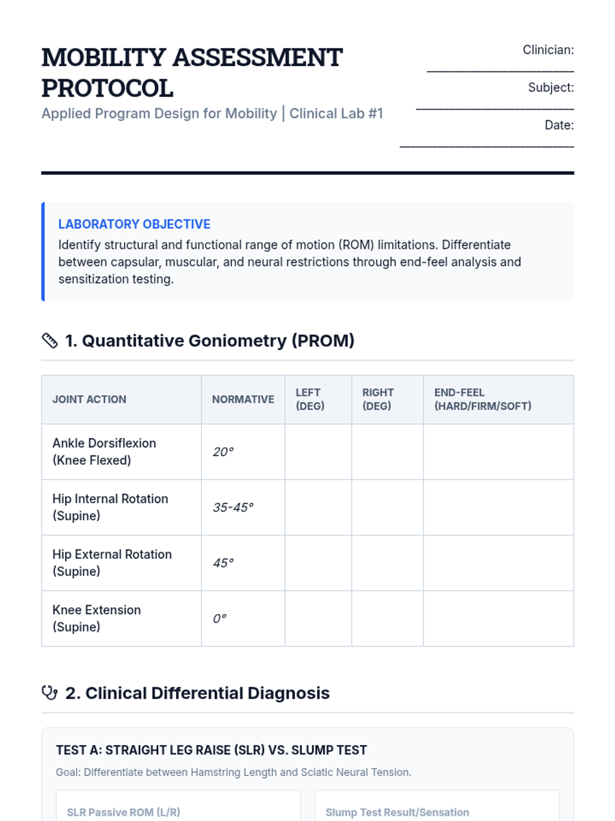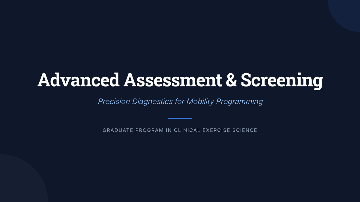A graduate-level sequence focused on the clinical and performance application of mobility training. Students progress from advanced assessment techniques and differential diagnosis to the design of periodized flexibility programs for diverse populations, emphasizing the 'joint-by-joint' approach and myofascial systems.