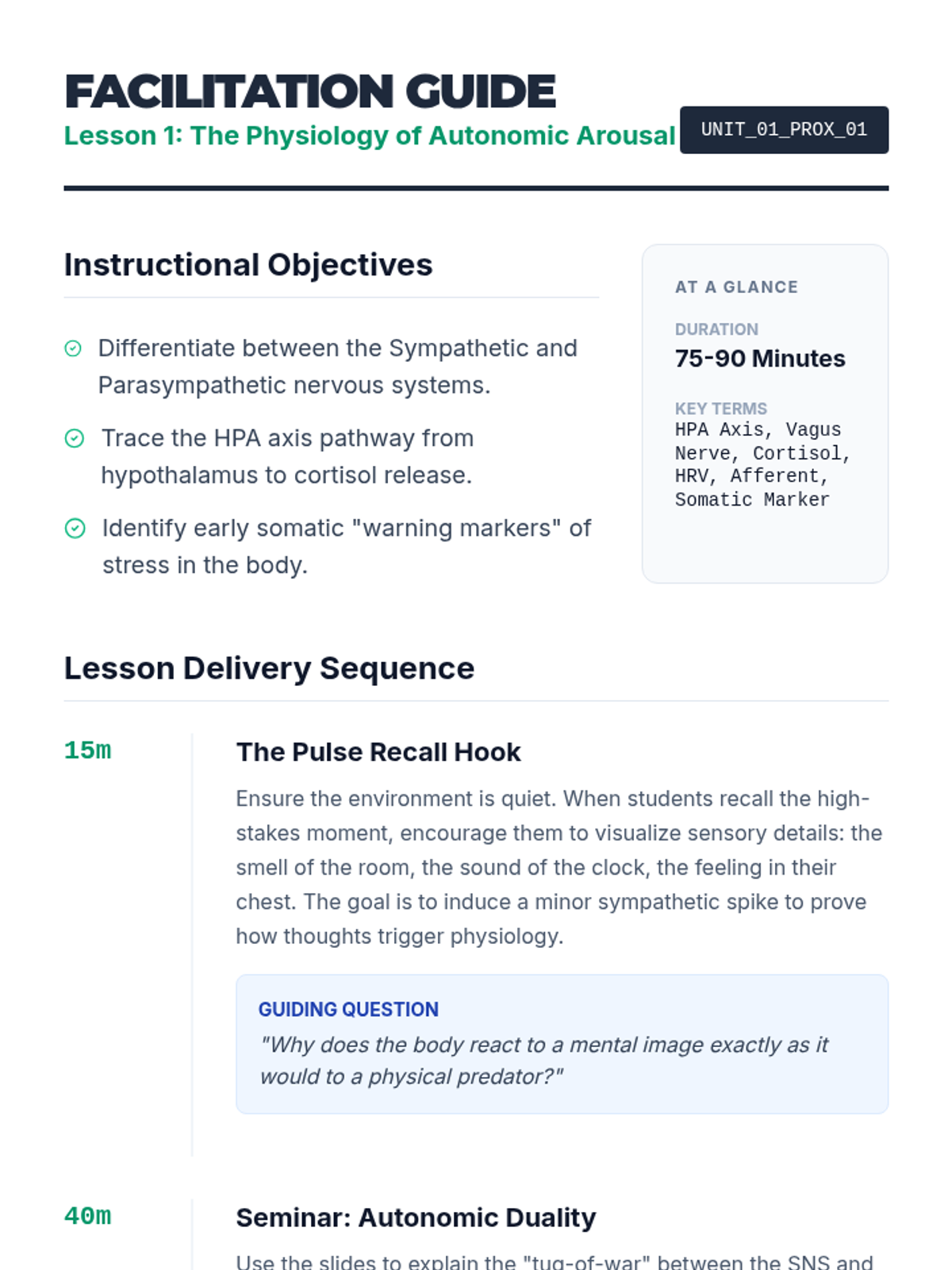 A high school health sequence that explores the neurobiological foundations of stress, focusing on the HPA axis, physiological symptom recognition, biofeedback techniques, and cognitive reframing to create a personalized stress regulation protocol.