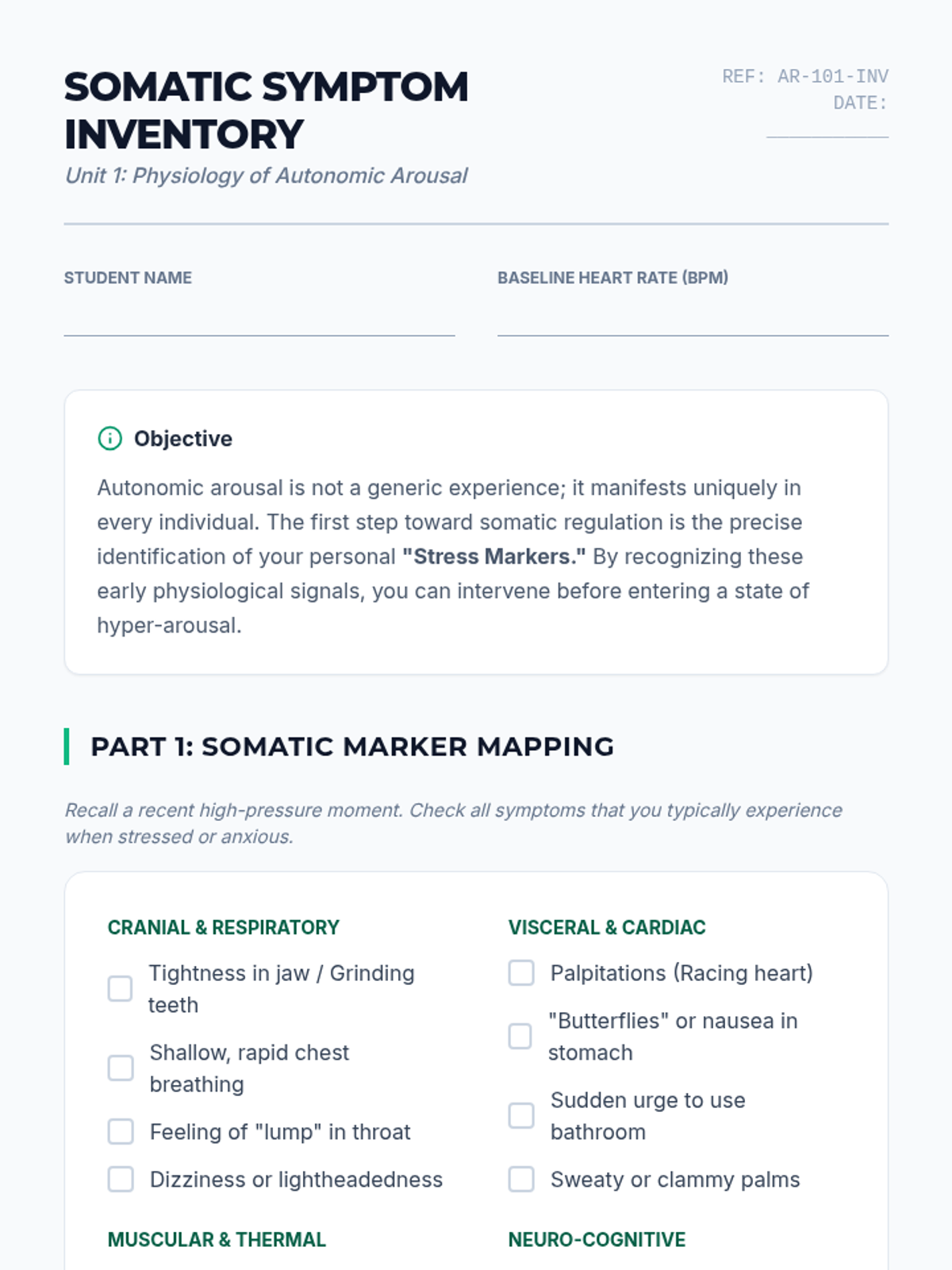 A rigorous graduate-level sequence exploring the neurobiological foundations of Progressive Muscle Relaxation (PMR), focusing on the Bernstein & Borkovec protocol, somatic awareness, and data-driven personal mastery.