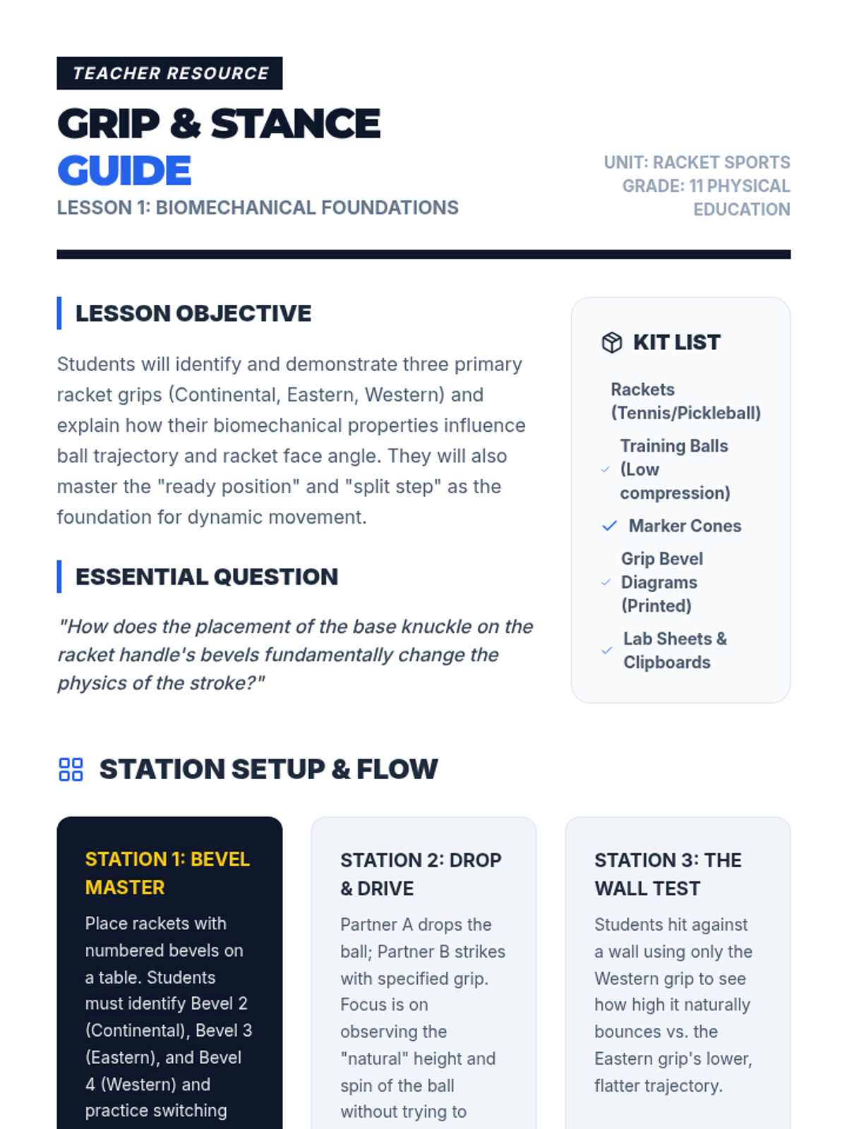 An advanced physical education unit for 11th-grade students focusing on the biomechanics, physics, and technical execution of racket sports (tennis, badminton, and pickleball). Students analyze the kinetic chain, grip variations, and stroke mechanics to optimize performance and prevent injury.