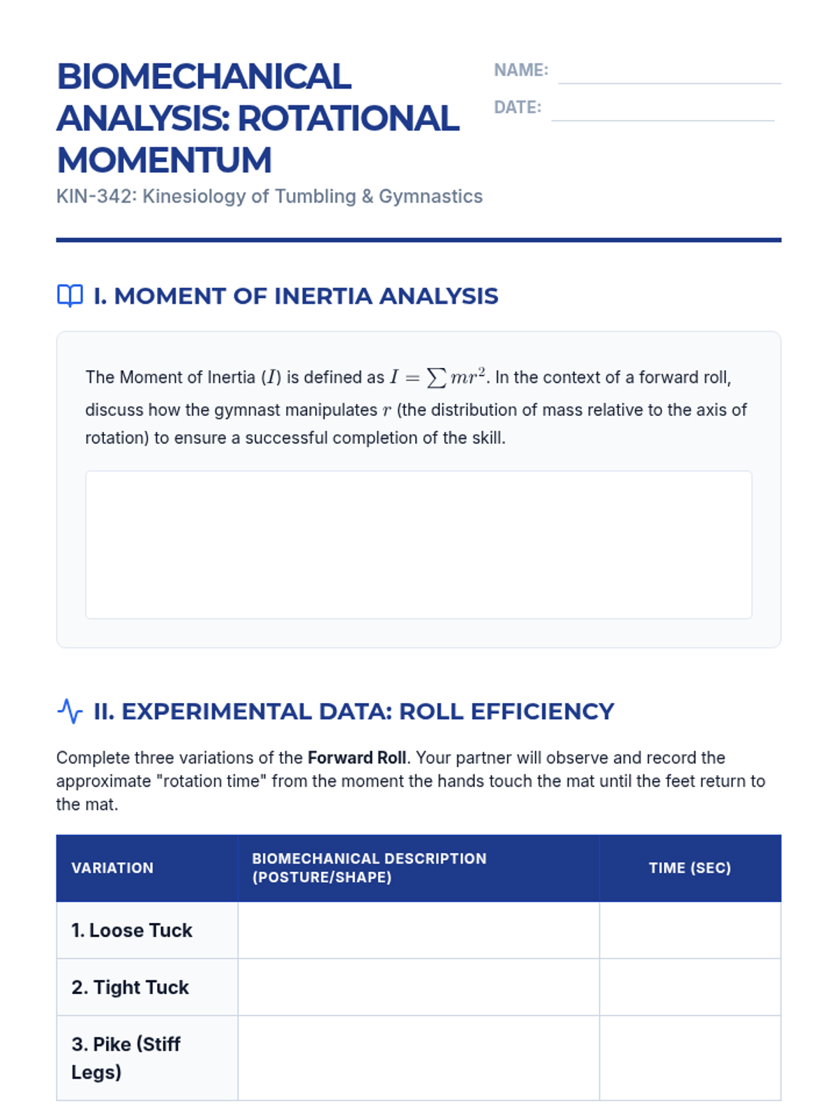 This sequence explores the physics of gymnastics, focusing on biomechanical principles like center of gravity, rotational inertia, and momentum transfer to improve tumbling performance. Students transition from static balance to dynamic rotation, culminating in a frame-by-frame video analysis of their own movement.