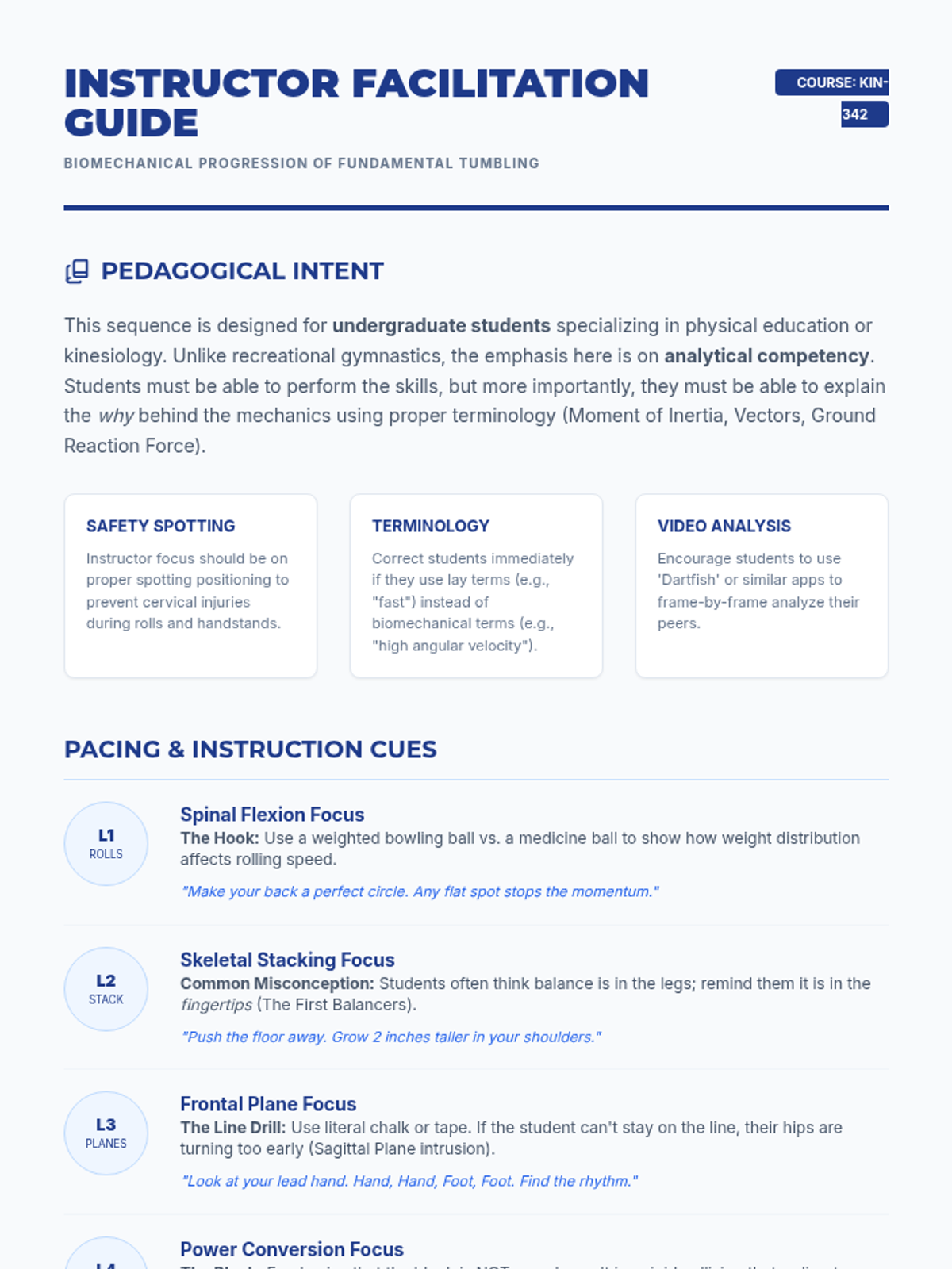 A comprehensive unit for undergraduate students focusing on the balance beam and vault. This sequence emphasizes the intersection of technical precision, biomechanical safety, and artistic composition in gymnastics, with a strong focus on peer-coaching and spotting.