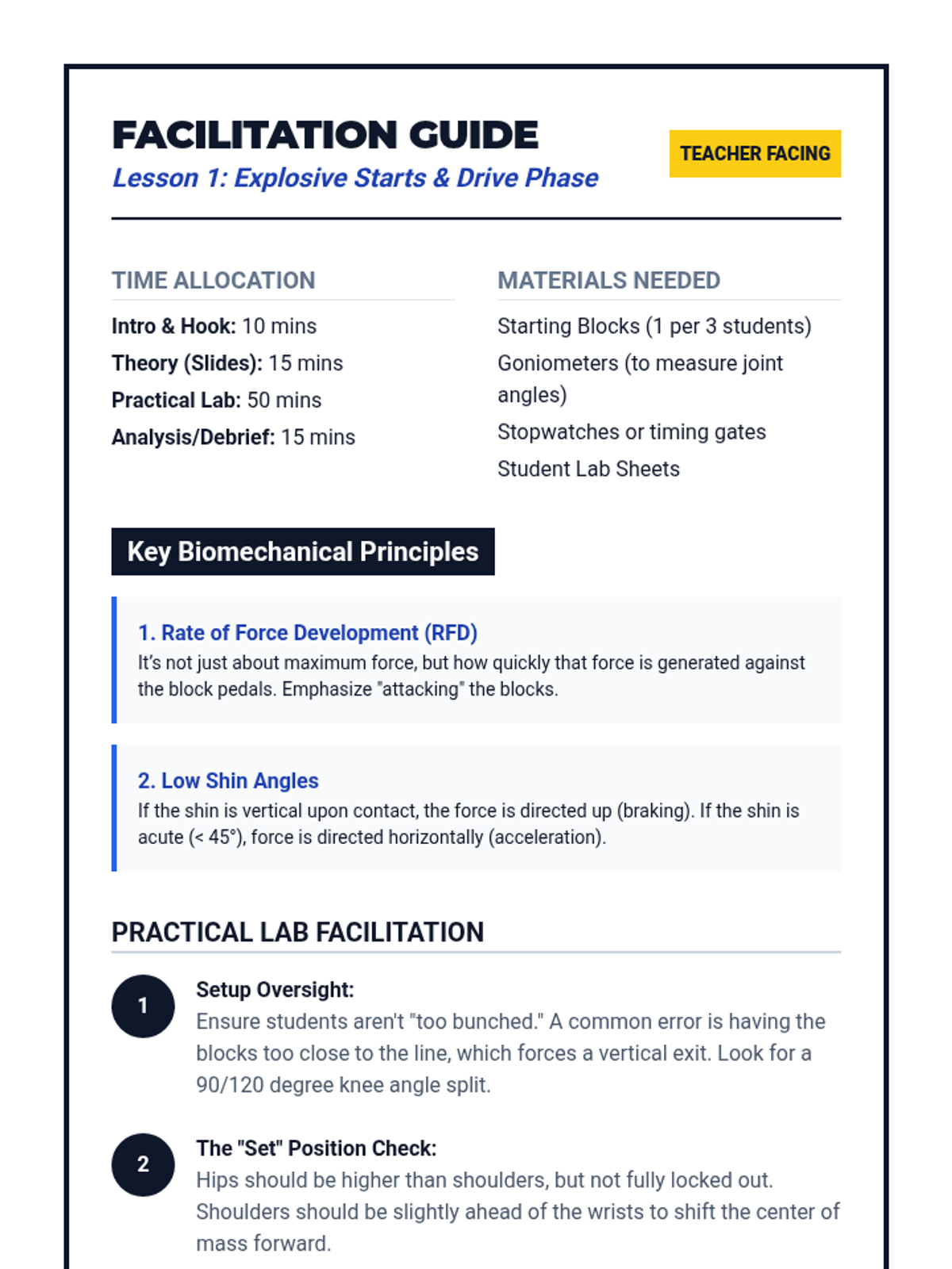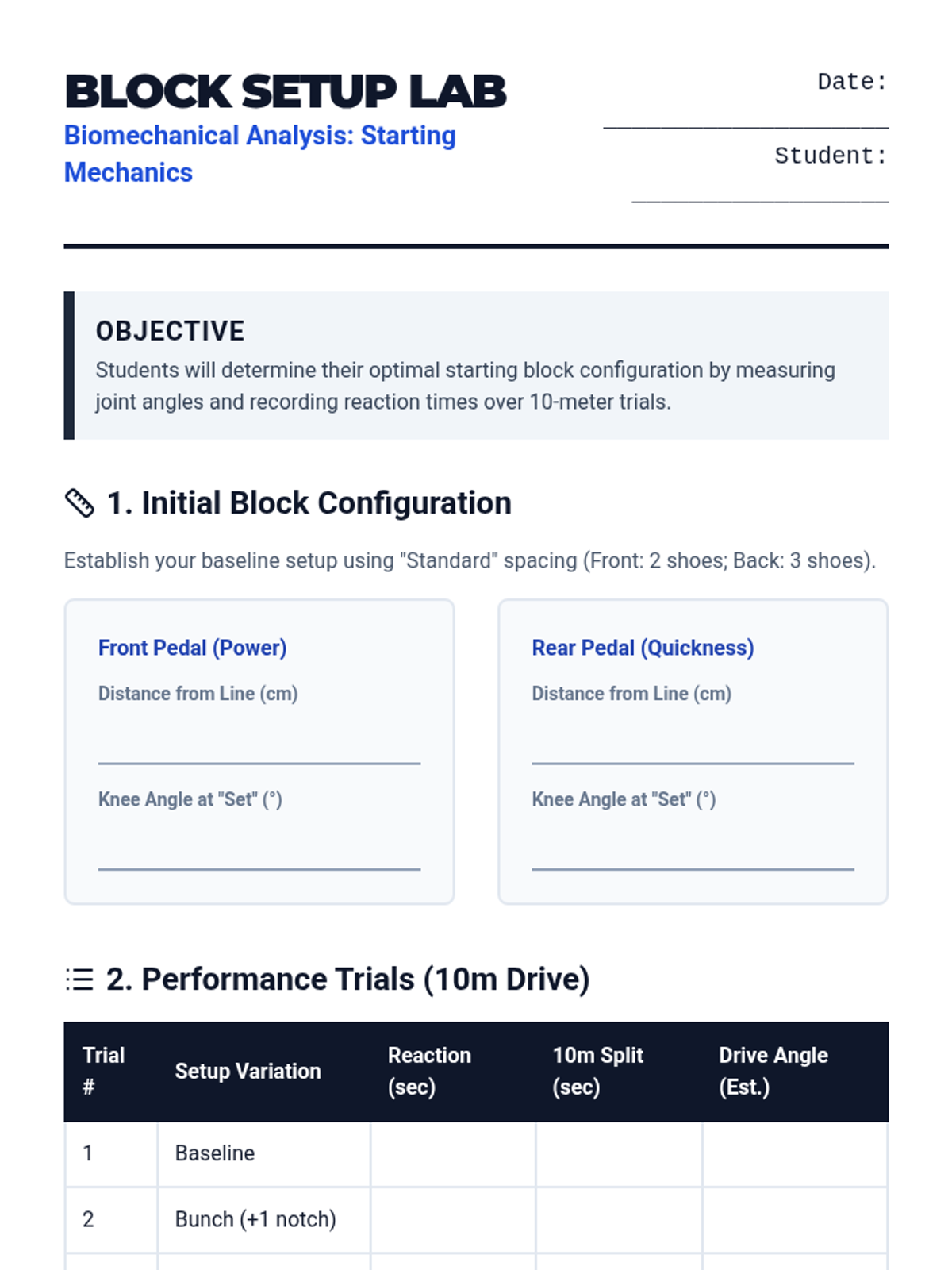 This sequence for undergraduate students explores the biomechanical principles and physiological demands of sprint and hurdle events. Students analyze force production, kinematics, and video data to bridge the gap between athletic performance and coaching science.