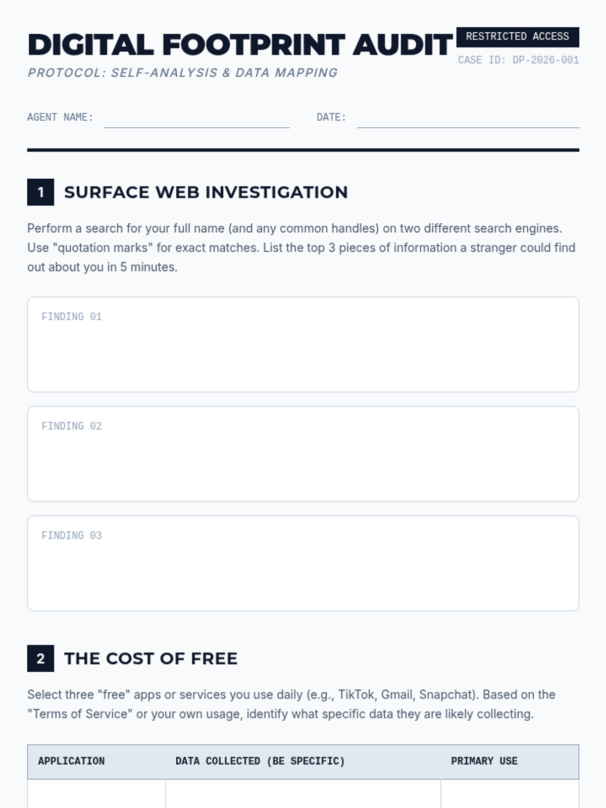 This sequence explores the intersection of data privacy, corporate profit, and government surveillance. Students analyze their own digital footprints, debate the merits of smart city technology, compare international privacy laws, and conclude by drafting their own 'Digital Bill of Rights'.