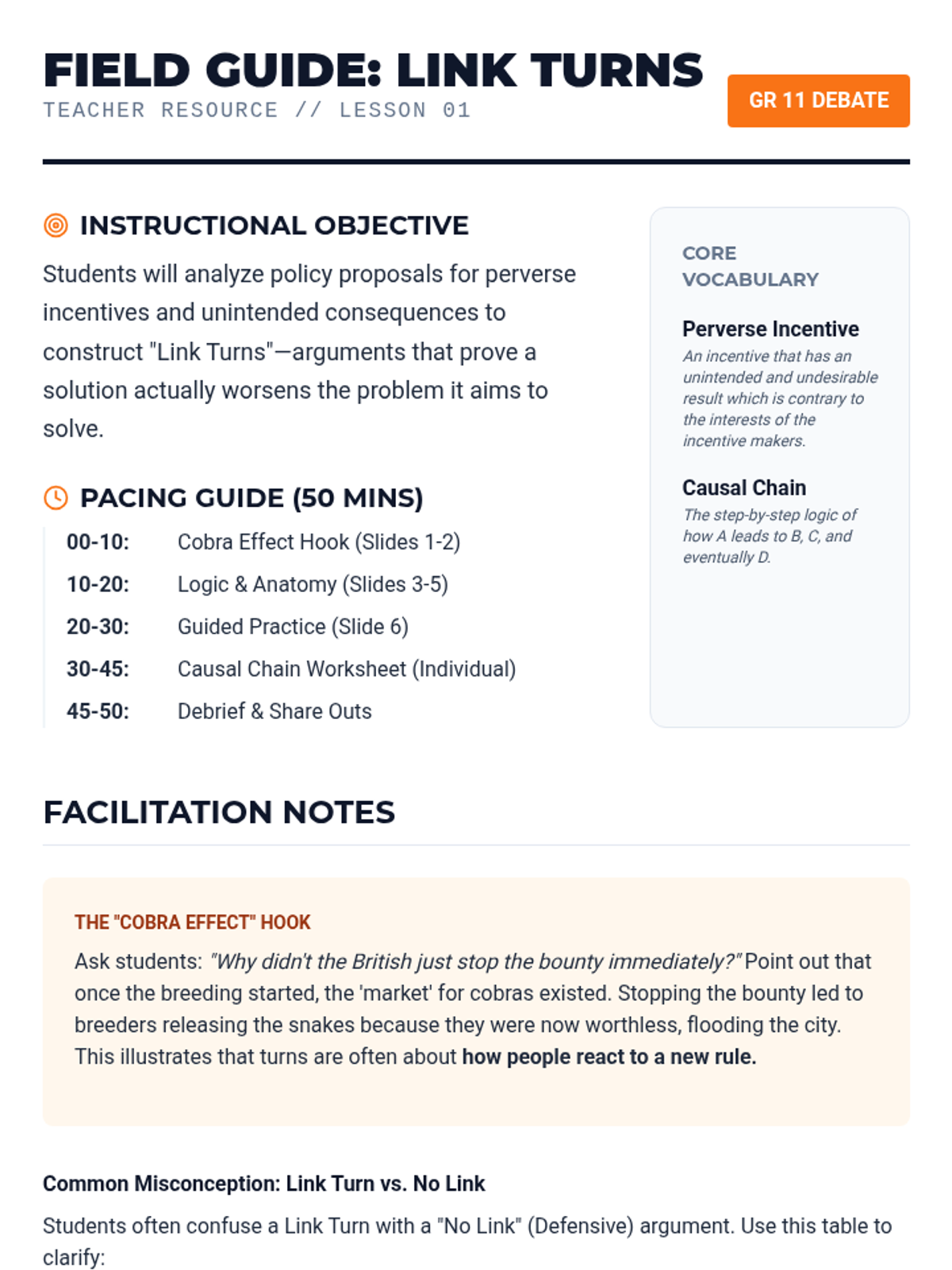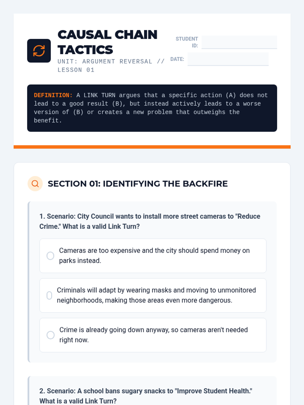 This advanced sequence introduces the concept of the 'turn'—using an opponent's argument against them. Students explore Link Turns and Impact Turns, practice logical consistency to avoid the 'double turn', and master the art of strategic concessions.