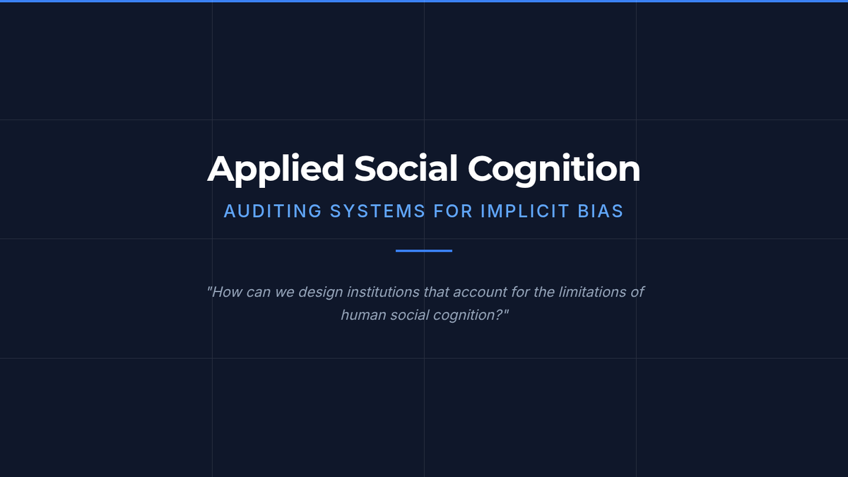 This graduate-level sequence focuses on the practical application of social cognition principles to design and implement debiasing interventions within institutional systems. Students progress from auditing existing structural inequities to designing, testing, and defending behavioral 'nudges' and architectural changes aimed at producing more equitable outcomes in fields like healthcare, criminal justice, and corporate hiring.