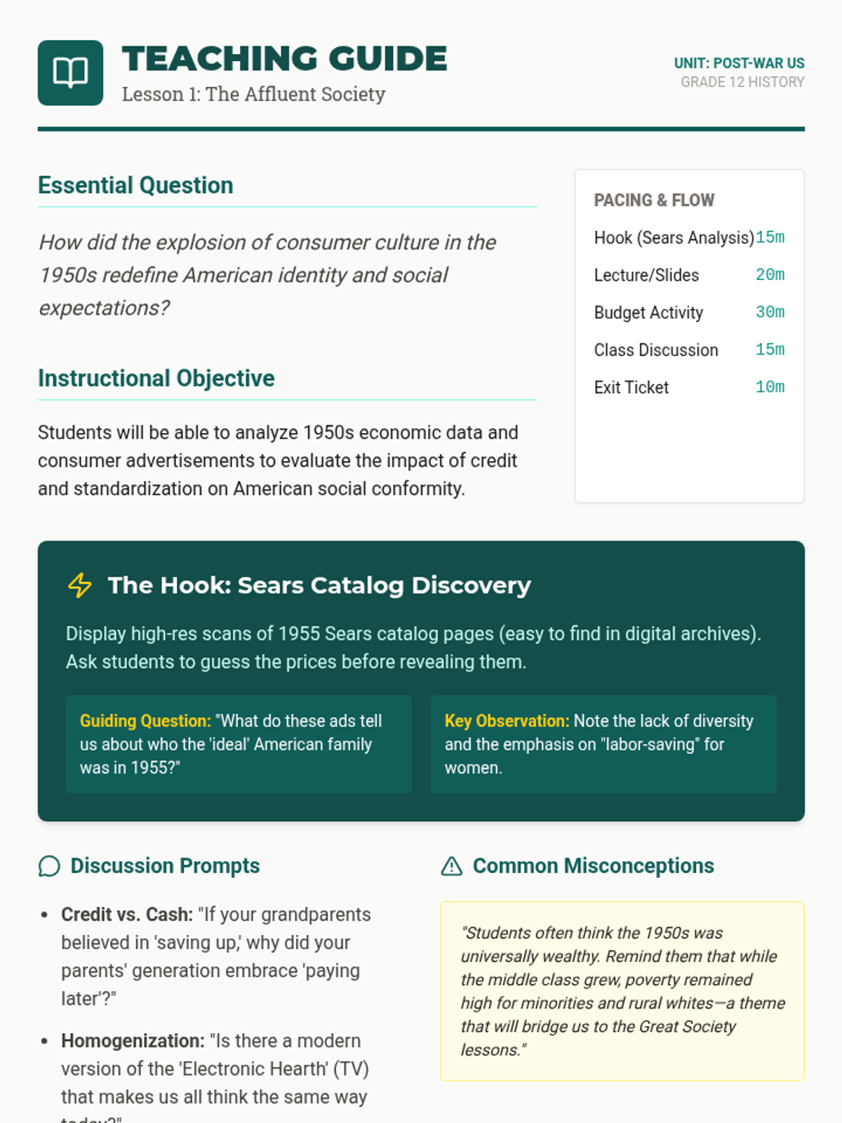 This sequence examines the socioeconomic shifts of the 1950s, focusing on the rise of suburbs, the consumer economy, and the accompanying pressures of conformity. Students will analyze the GI Bill, advertising, gender roles, and the emergence of youth culture and the Beat Generation to critique the narrative of a monolithic postwar consensus.