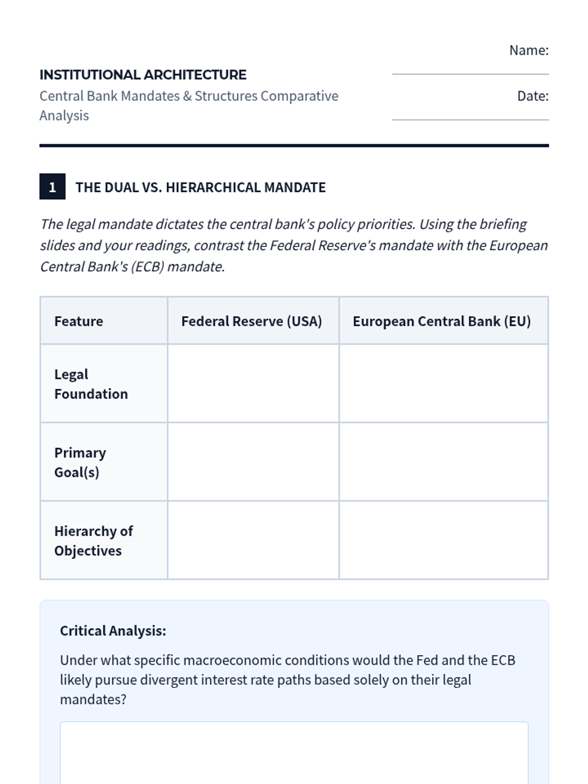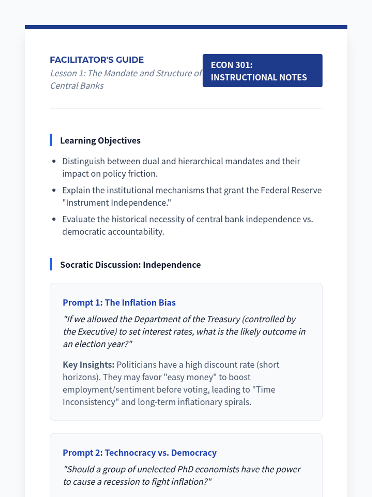 An undergraduate-level exploration of central banking operations, monetary policy frameworks, and financial stability. Students analyze the Federal Reserve's tools, transmission mechanisms, and crisis response strategies, culminating in a simulated FOMC policy meeting.