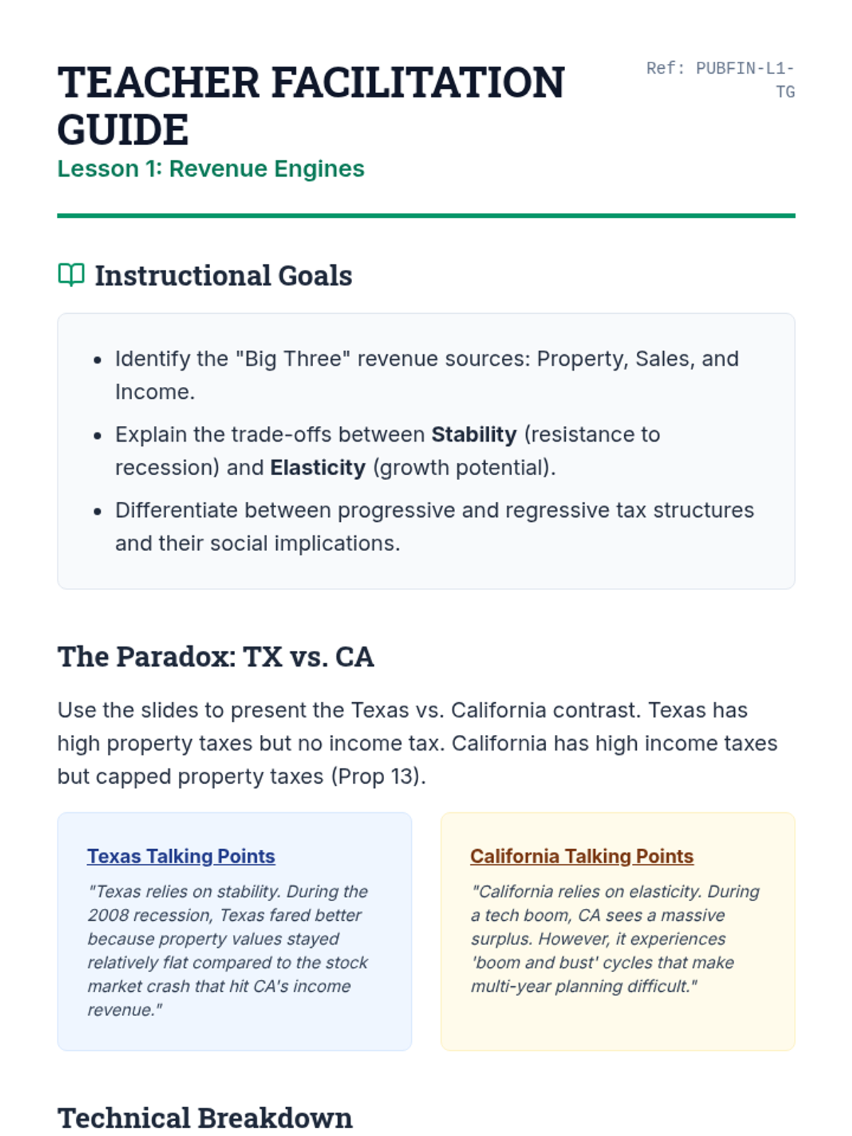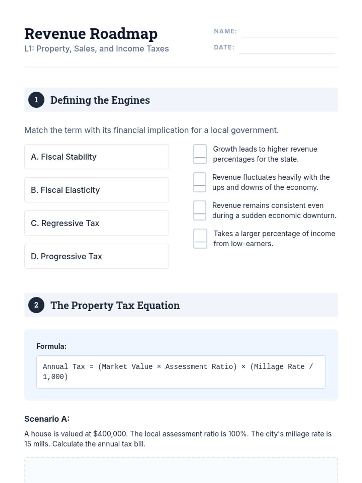This sequence explores the mechanics of state and local public finance, focusing on revenue sources, budgeting processes, debt financing, and the challenges of fiscal stress. Students will analyze how local governments manage their limited resources within strict legal and economic constraints.