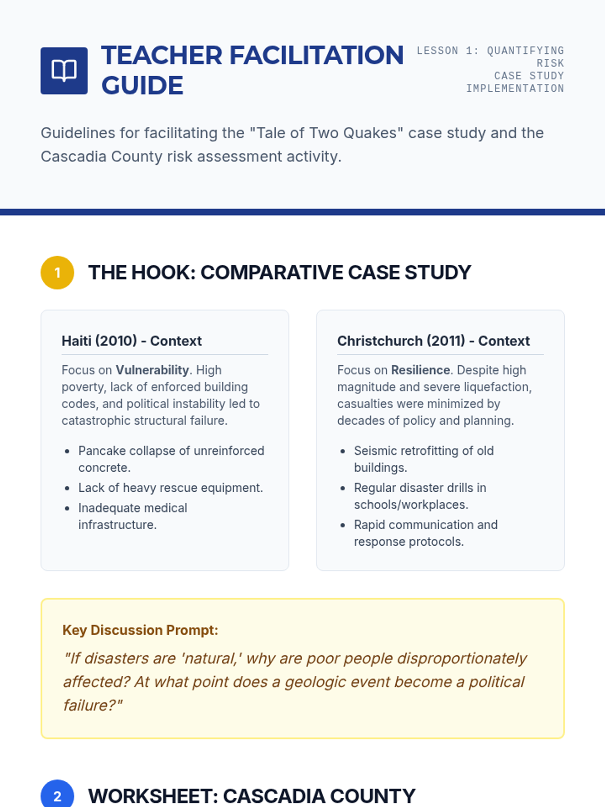A 12th-grade capstone sequence merging earth science with public policy. Students analyze geologic hazards through the lens of risk assessment, urban planning, disaster response, and economic analysis to draft comprehensive policy proposals.