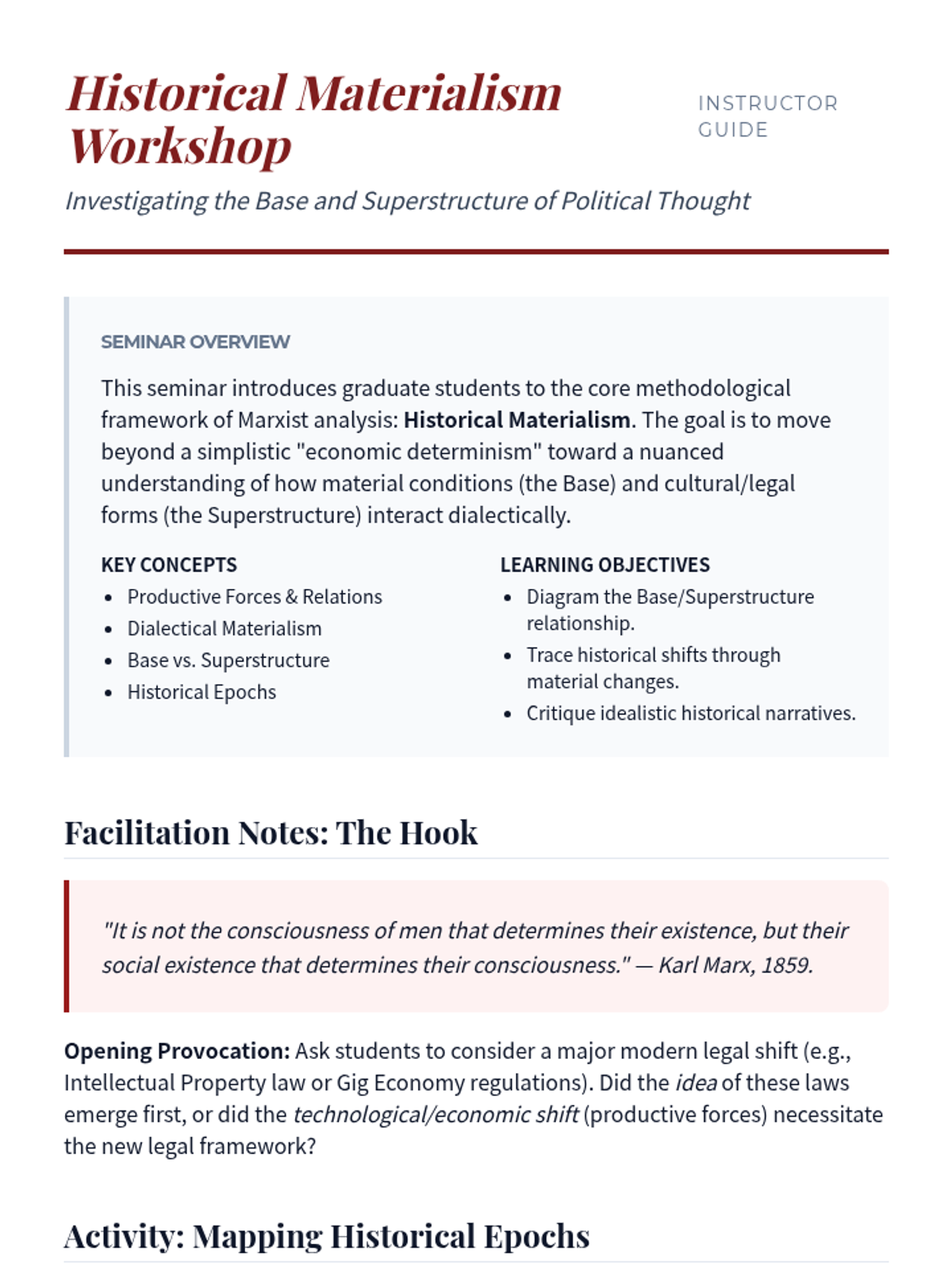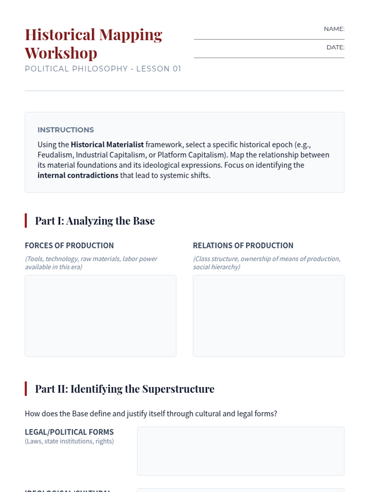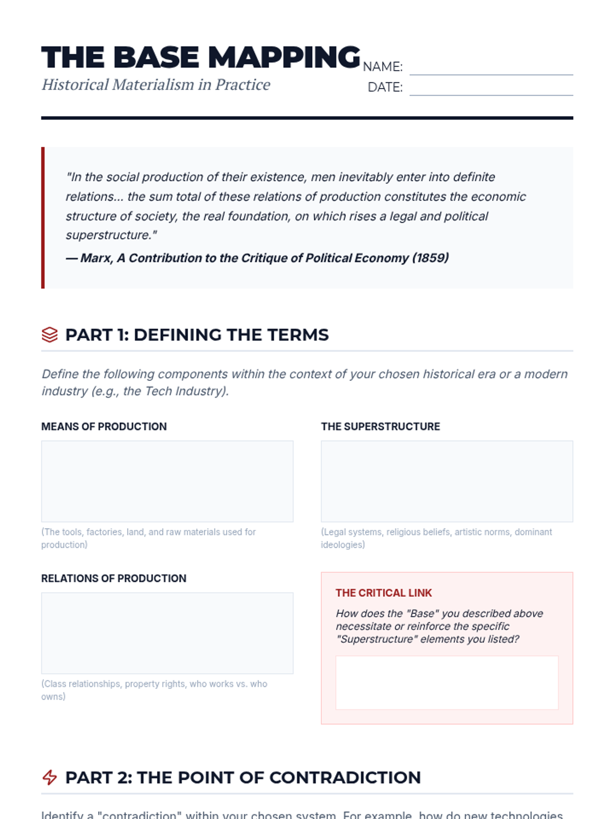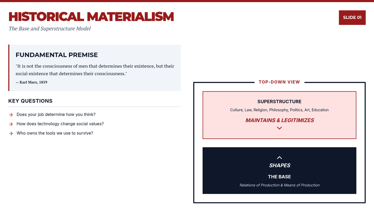 An undergraduate-level exploration of Marxism and Critical Theory, focusing on the materialist conception of history, theories of alienation and exploitation, and the development of the Frankfurt School's critique of the culture industry. Students move from economic foundations to cultural analysis to diagnose systemic issues in contemporary society.