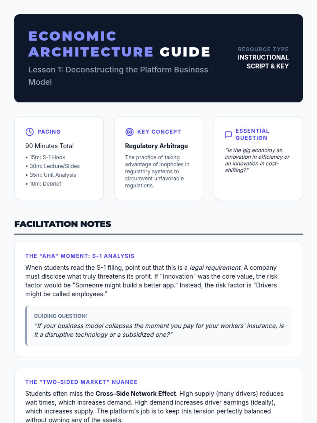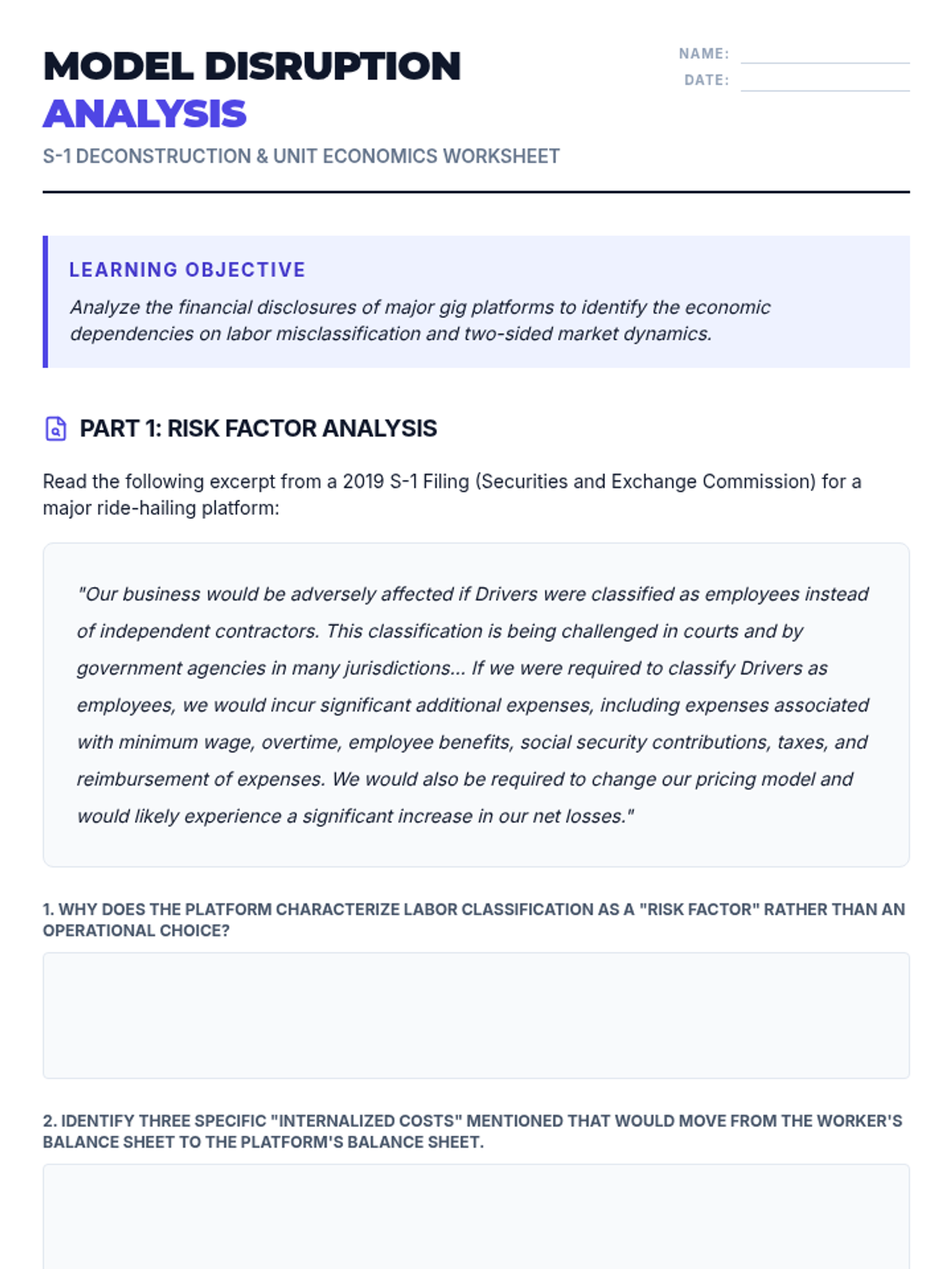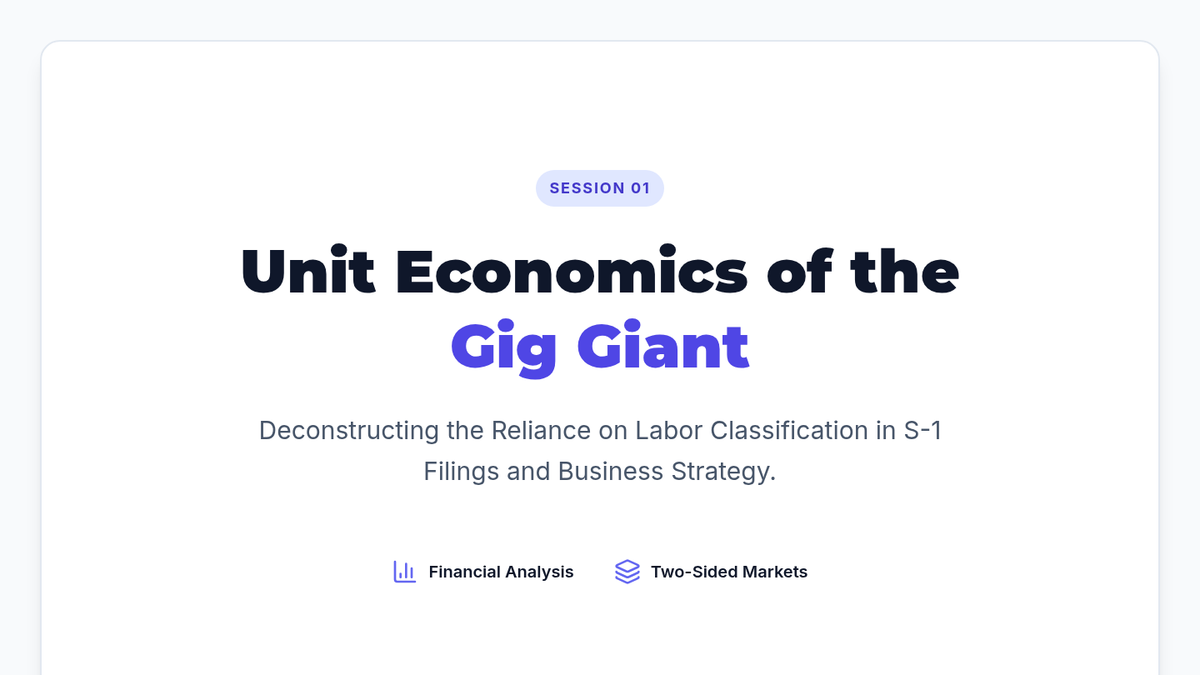 A graduate-level exploration of the gig economy's regulatory challenges, investigating business models, labor law definitions, algorithmic control, and future policy solutions. Students deconstruct platform economics and design modernized labor frameworks for the 21st-century workforce.