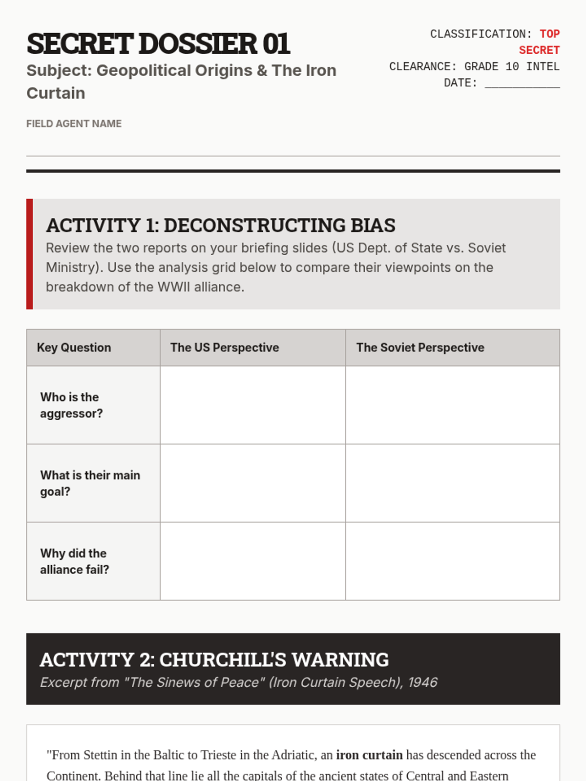 An immersive unit on the Cold War, styled as a series of declassified intelligence briefings exploring the global struggle for power between 1945 and 1991.