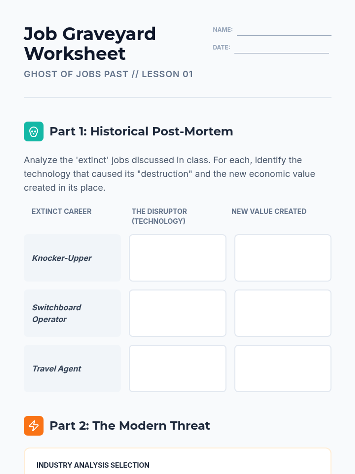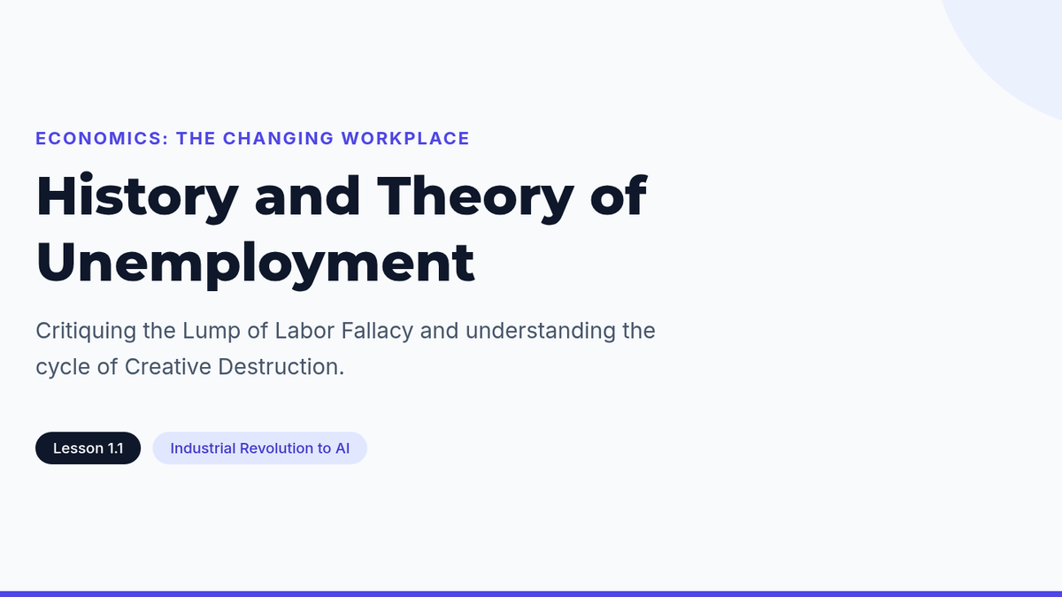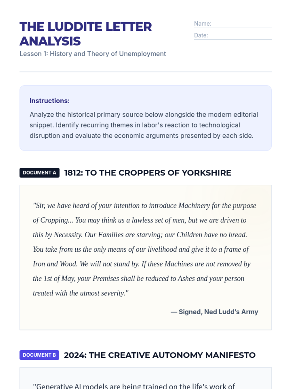 This sequence explores the macroeconomic impact of automation, artificial intelligence, and globalization on the future labor market. Students analyze historical shifts, evaluate automation risks, simulate global hiring, and design policy proposals for a post-labor economy.