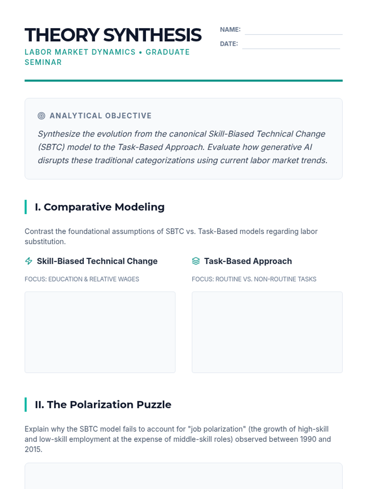 This sequence investigates the impact of automation, robotics, and artificial intelligence on workforce demand and skill requirements. Students perform sophisticated task-level analyses, distinguishing between substitution and complementarity while developing strategic workforce plans for a disrupted future.