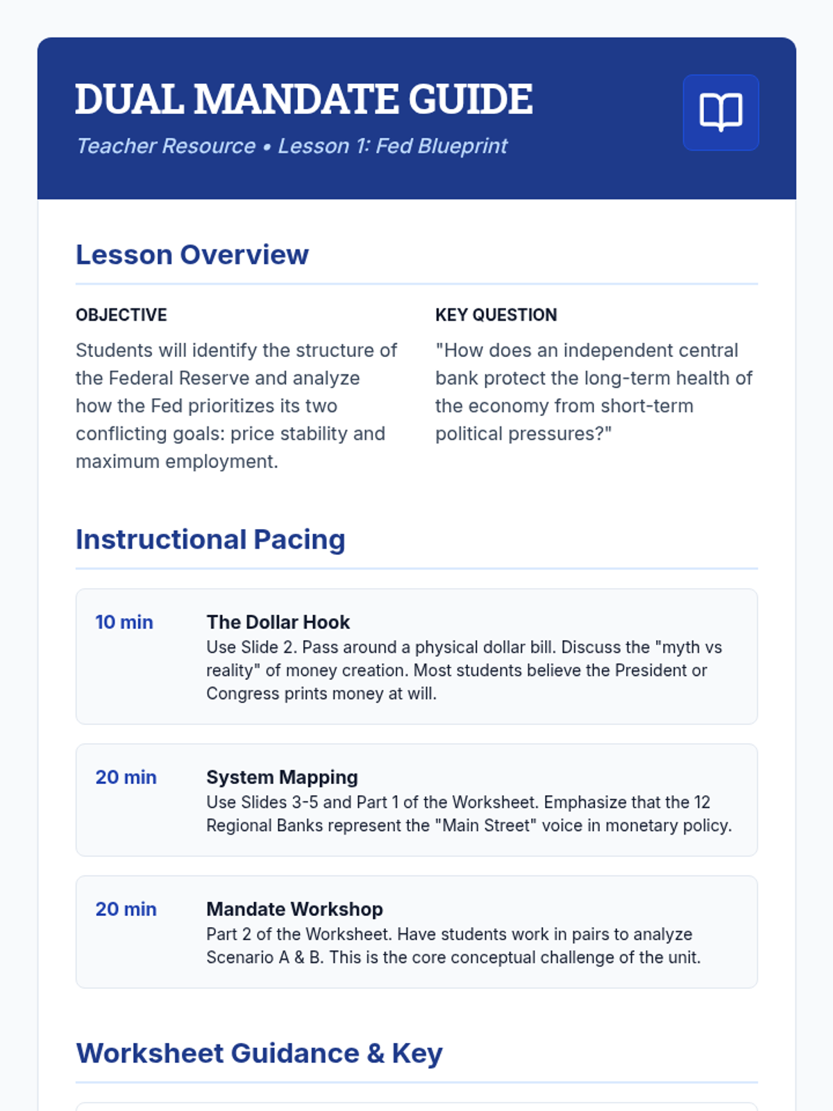 A comprehensive 12th-grade unit on the Federal Reserve, exploring how monetary policy levers influence national stability, employment, and the value of currency through case studies and simulations.