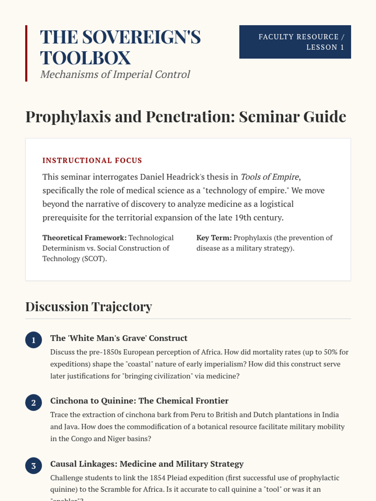 This project-based sequence traces modern global conflicts and economic disparities back to their colonial origins. Students analyze the Sykes-Picot Agreement, the Rwandan genocide, and neo-colonialism before conducting independent research on a specific country's legacy.