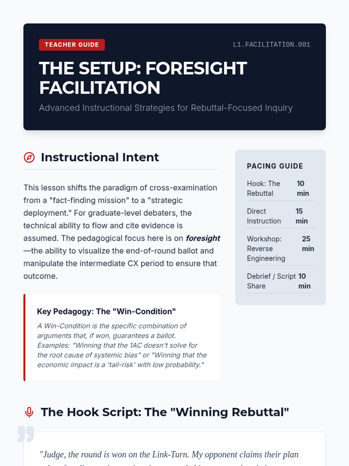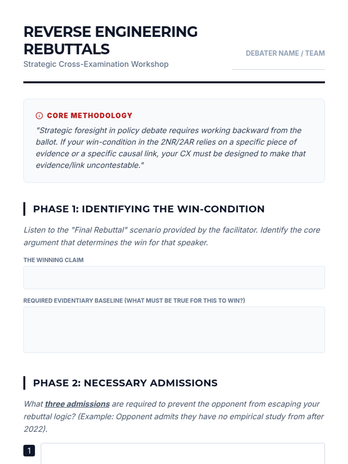 An advanced course for graduate-level policy debaters focusing on the strategic integration of cross-examination into overall round strategy. Students learn to use the CX period to dismantle links, perform impact calculus, and set up winning rebuttal arguments through tactical inquiry.