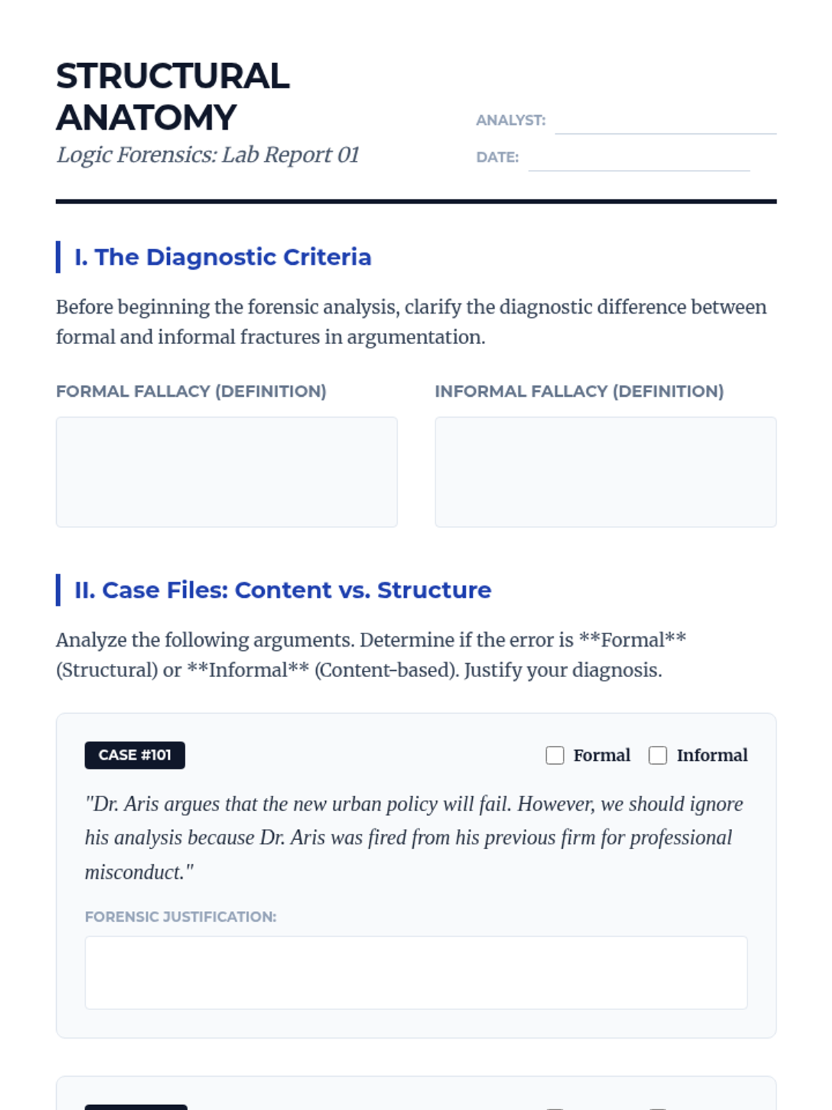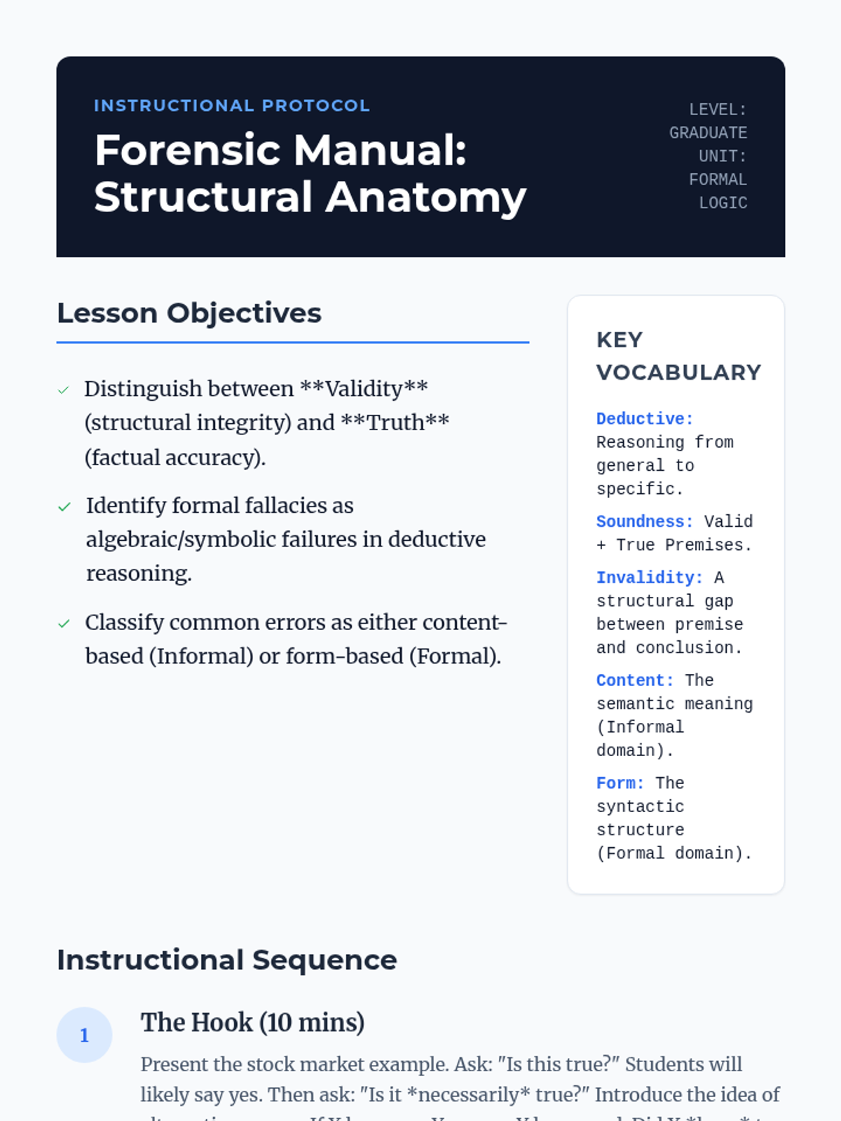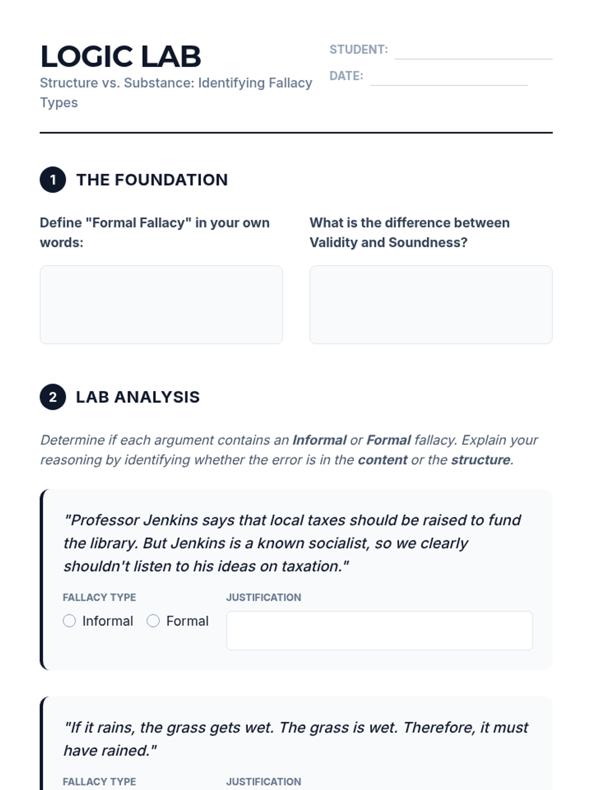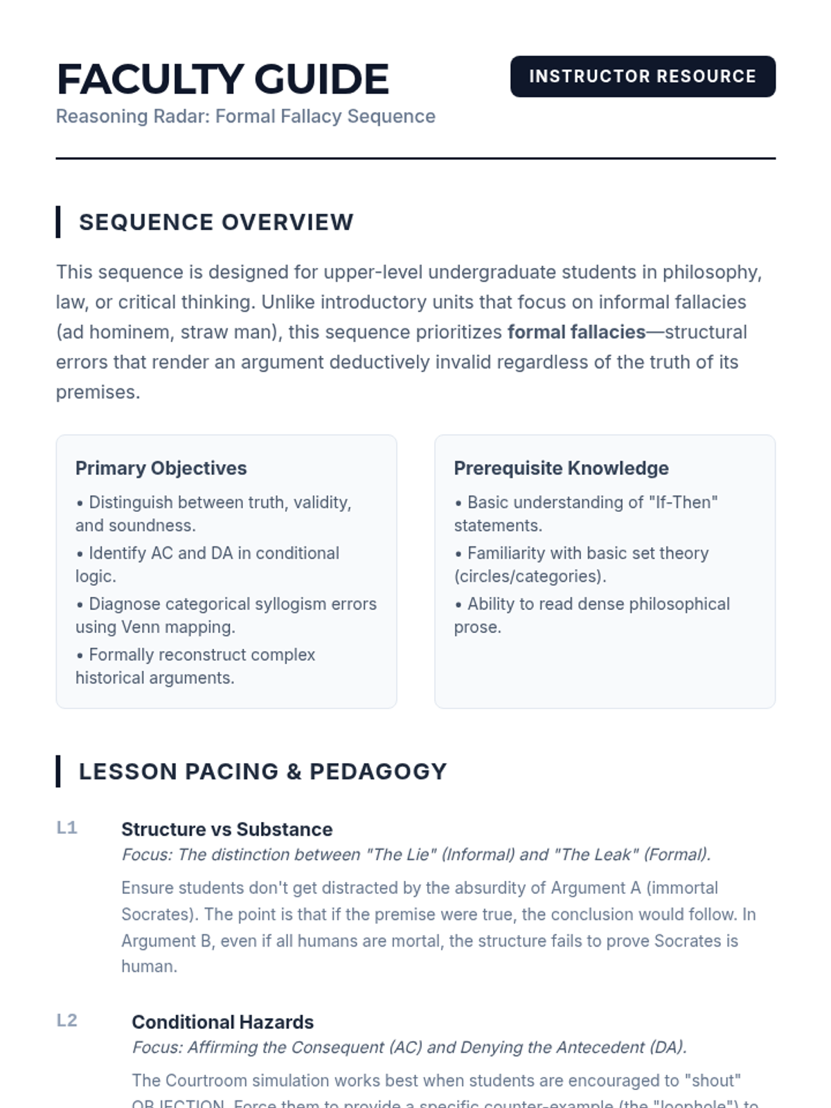 An advanced critical thinking sequence for undergraduate students focused on identifying structural errors in reasoning. Students move from informal fallacies to complex formal fallacies, using real-world legal and philosophical texts to evaluate validity through the lens of formal logic.