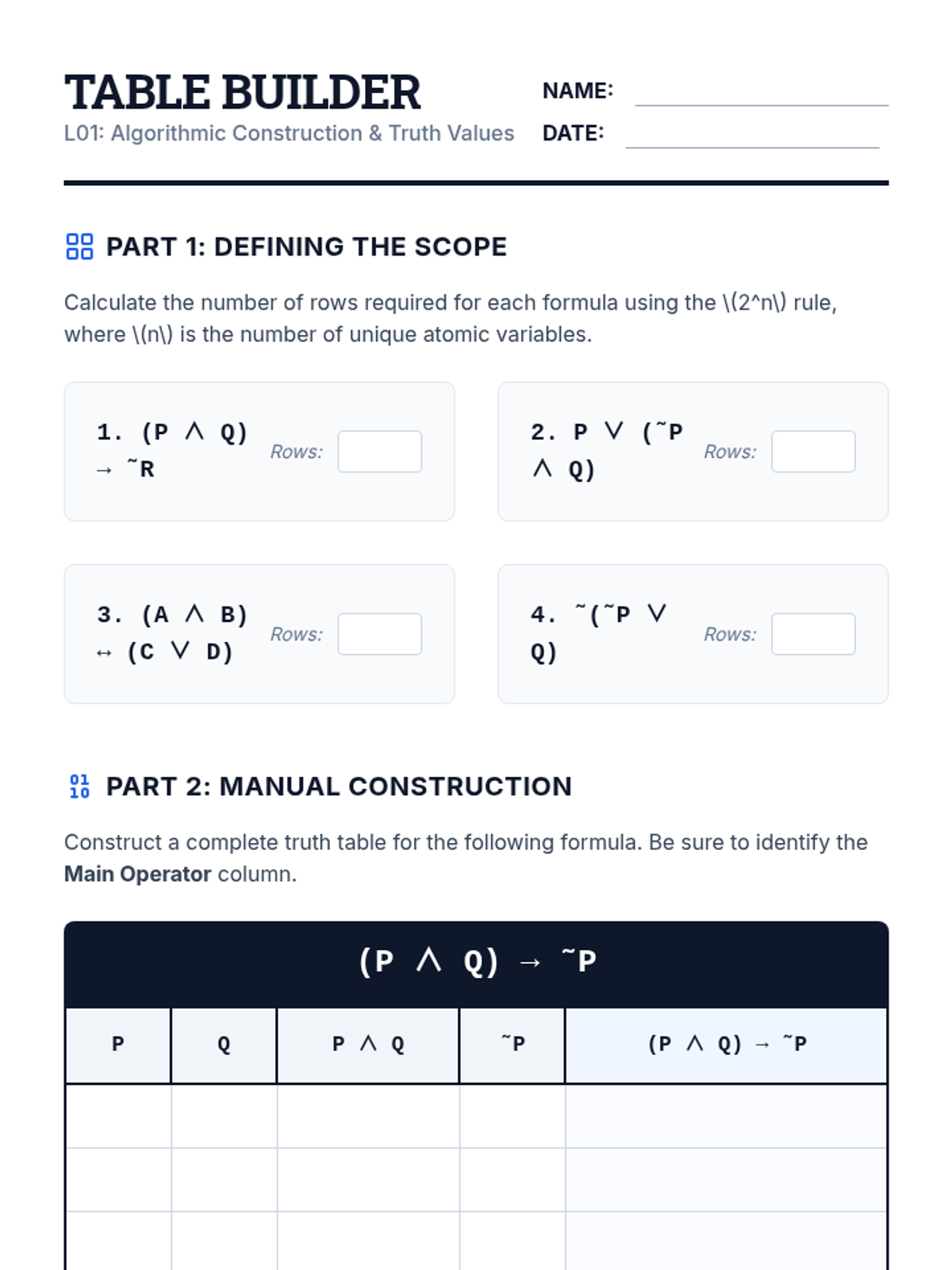 This rigorous graduate-level sequence guides students through the mechanical verification of argument validity using truth tables and semantic analysis, culminating in the logical critique of academic texts.