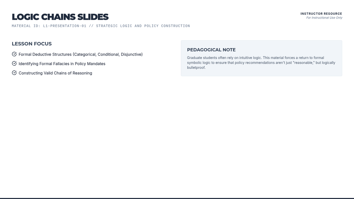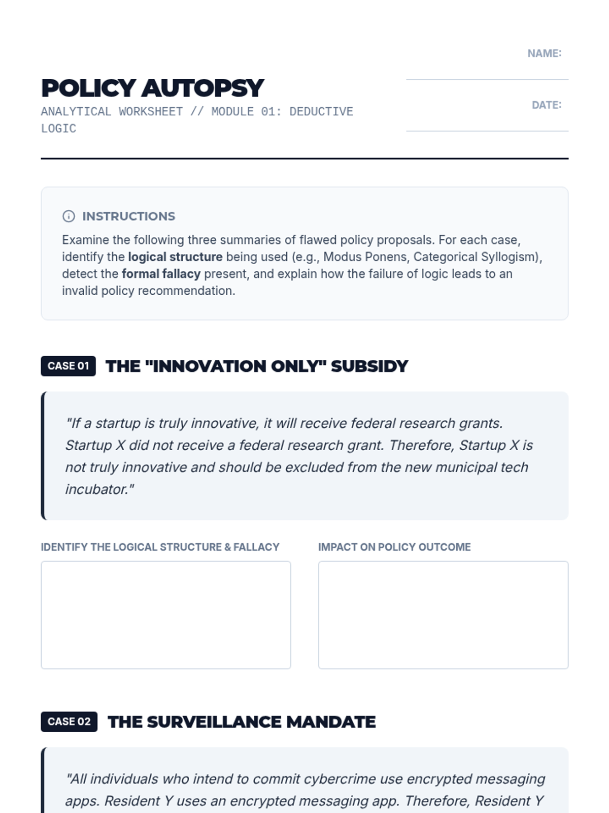 This sequence focuses on the rigorous application of deductive and inductive reasoning within the context of policy formulation and advocacy for graduate students. Participants will move from abstract logical structures to the creation and defense of a professional policy brief.