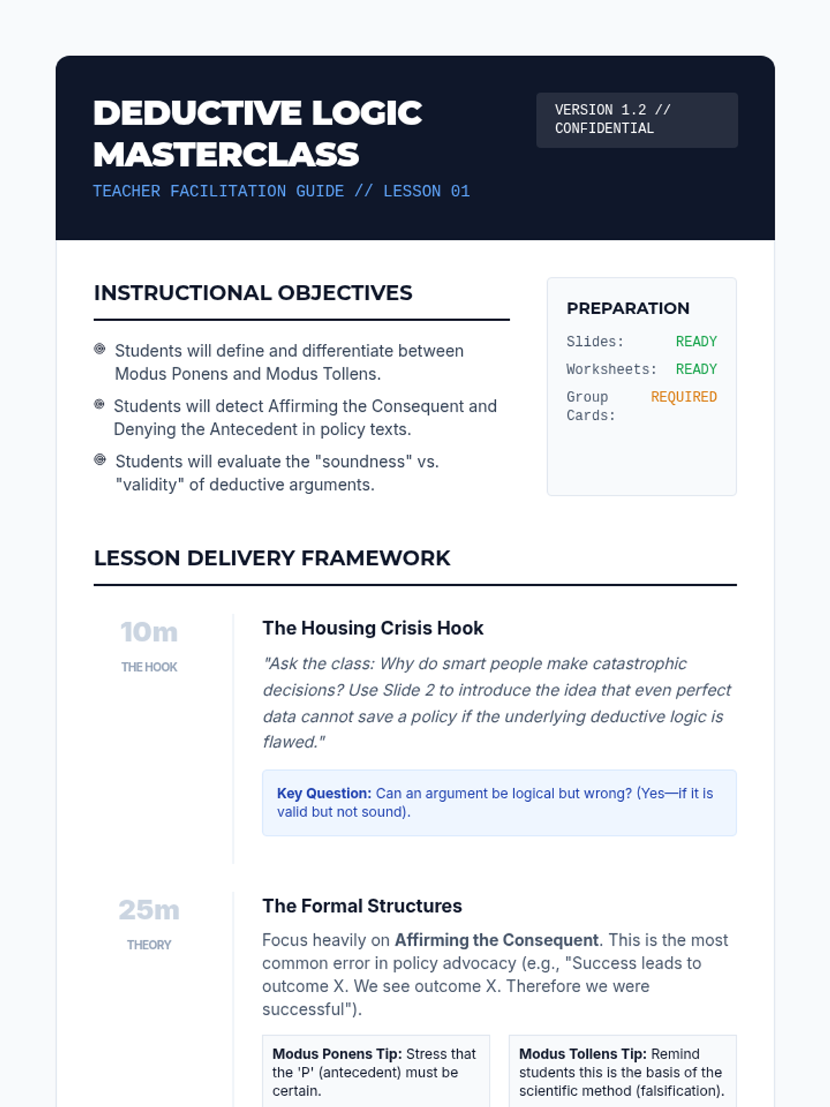 A comprehensive unit for undergraduate students on identifying and deconstructing logical fallacies and cognitive biases in public discourse. Students develop the critical thinking skills necessary to evaluate the integrity of arguments in politics, media, and everyday life.