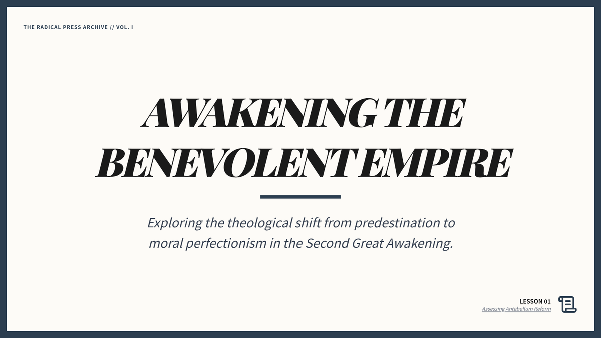 This undergraduate-level sequence explores the intellectual and religious roots of the Antebellum reform era, tracing the evolution from gradualism to radical abolitionism and its intersection with the early women's rights movement. Students analyze primary sources, rhetorical strategies, and the role of the press in shifting national discourse on slavery and equality.