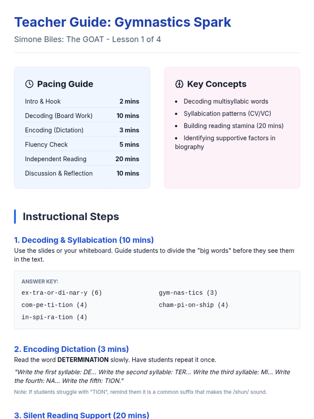 A teacher's facilitation guide for the Simone Biles lesson. Includes a detailed pacing guide, decoding answer key, dictation script, and specific strategies for supporting students with learning disabilities during high-stamina silent reading.
