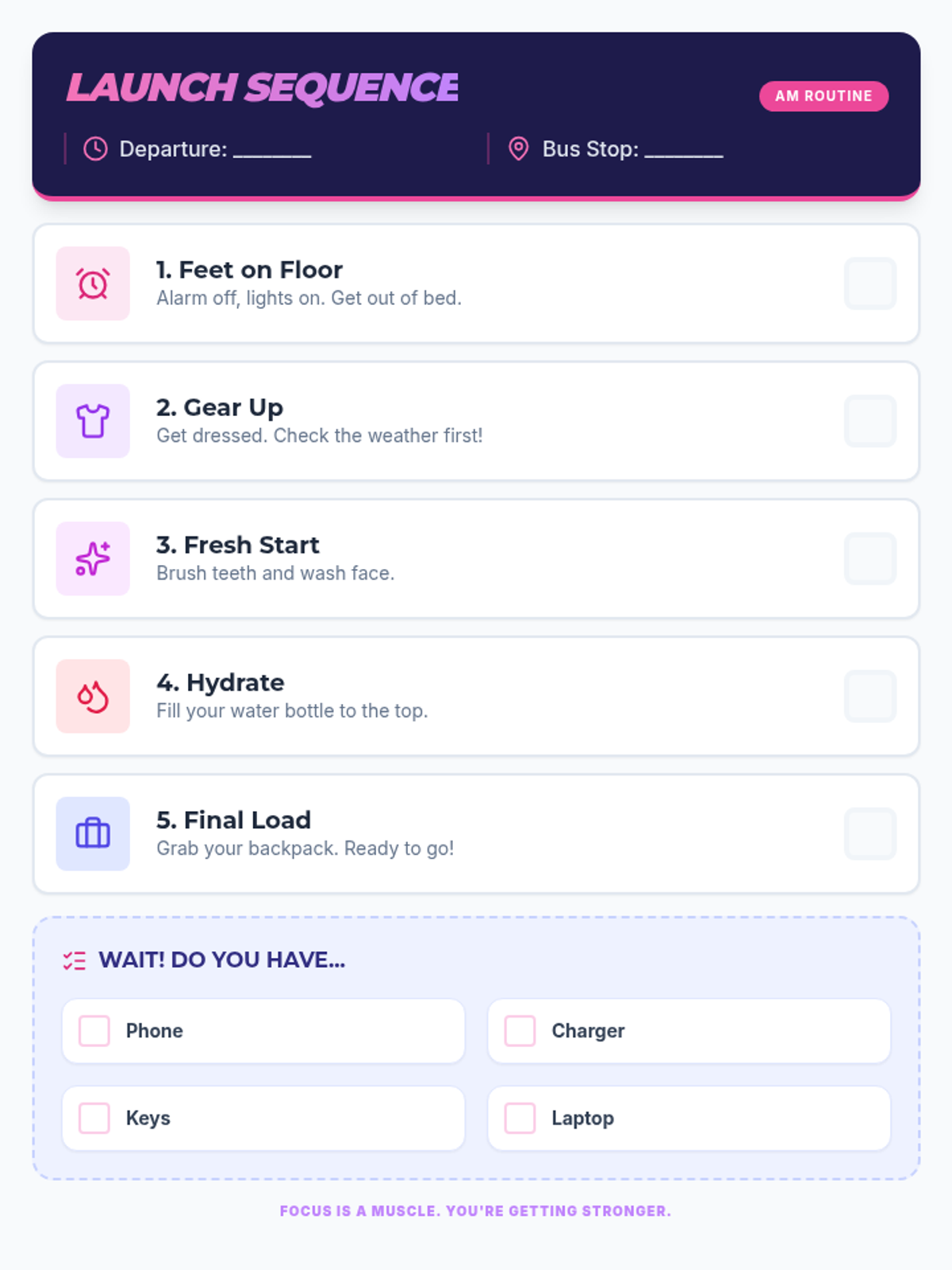 A clean, modern morning checklist designed for a high school freshman with ADHD. It features pink and purple tones, bold icons, clear task descriptions, and a high-contrast 'launch sequence' theme to assist with task initiation and routine building.