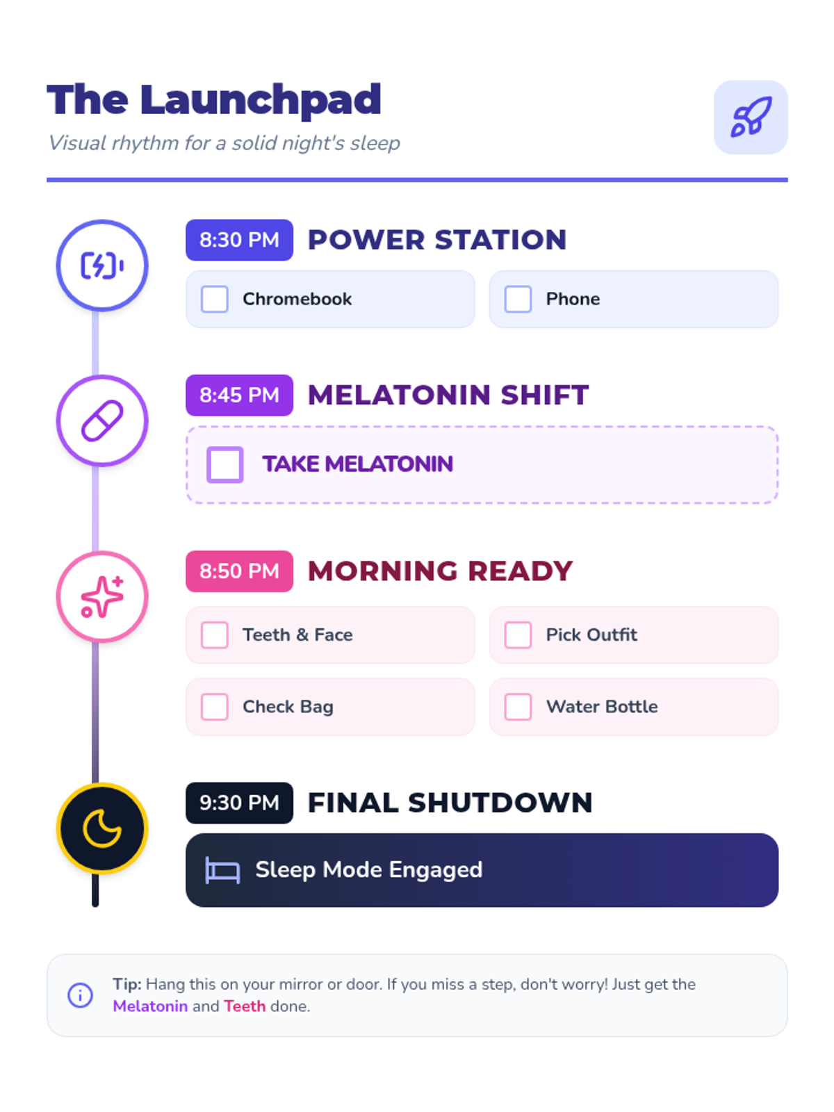 A high-contrast visual schedule for a teenage bedroom or bathroom mirror, utilizing bold icons and color-coding to guide users through the evening transition. Properly formatted for a single 8.5x11 inch page.