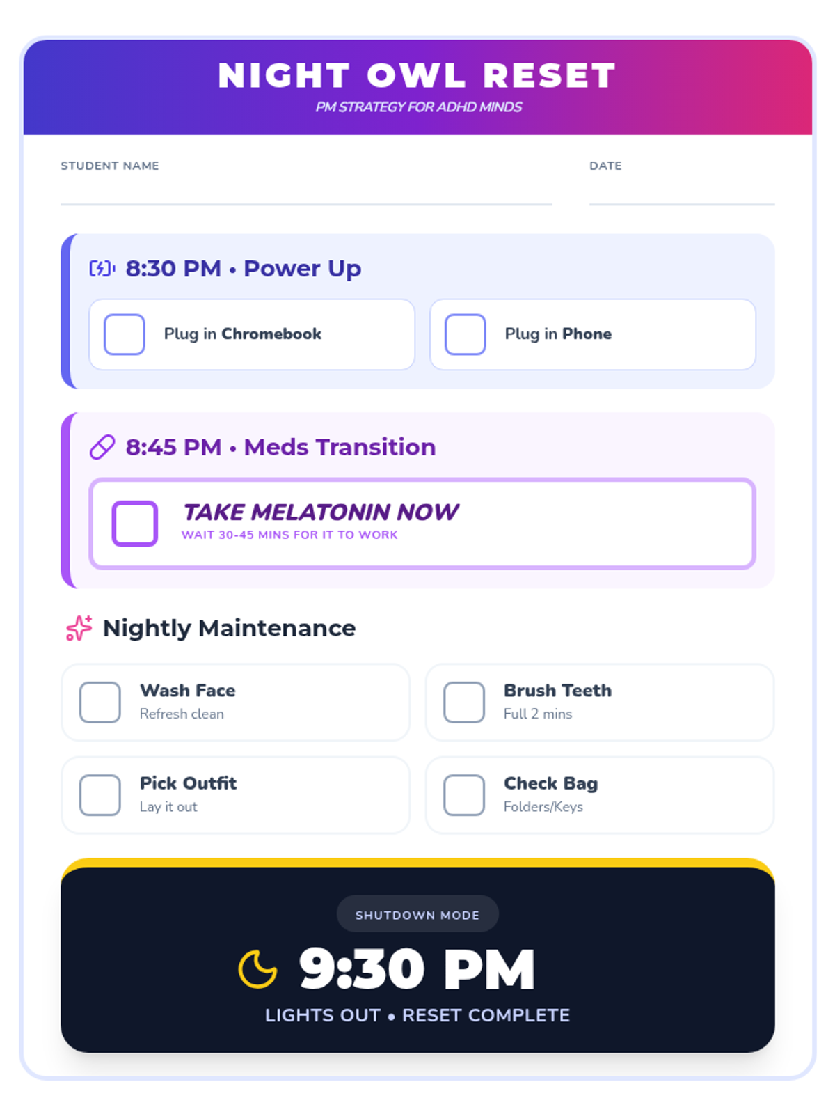 A structured printable checklist for teenagers with ADHD, featuring clear time-based milestones and a focused "Maintenance Mode" for nightly self-care and preparation. Properly formatted for a single 8.5x11 inch page.