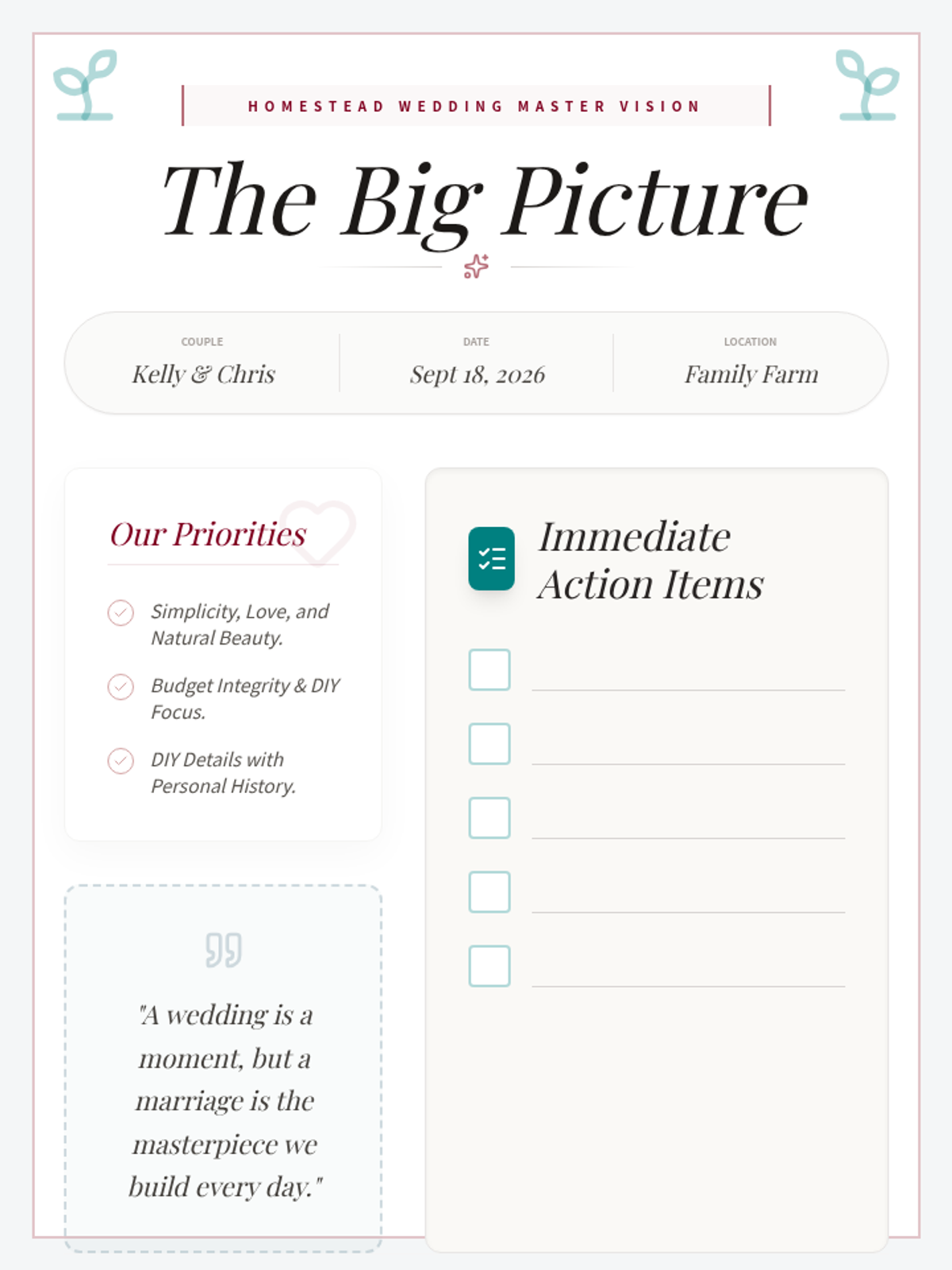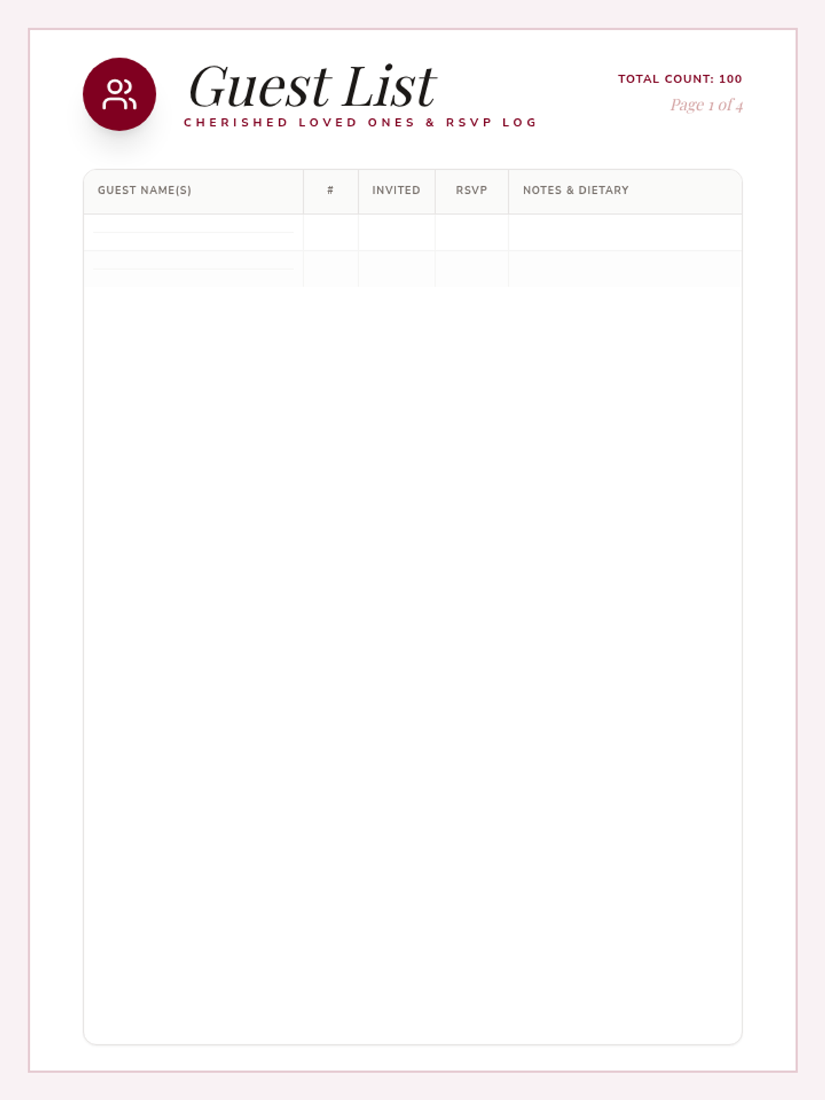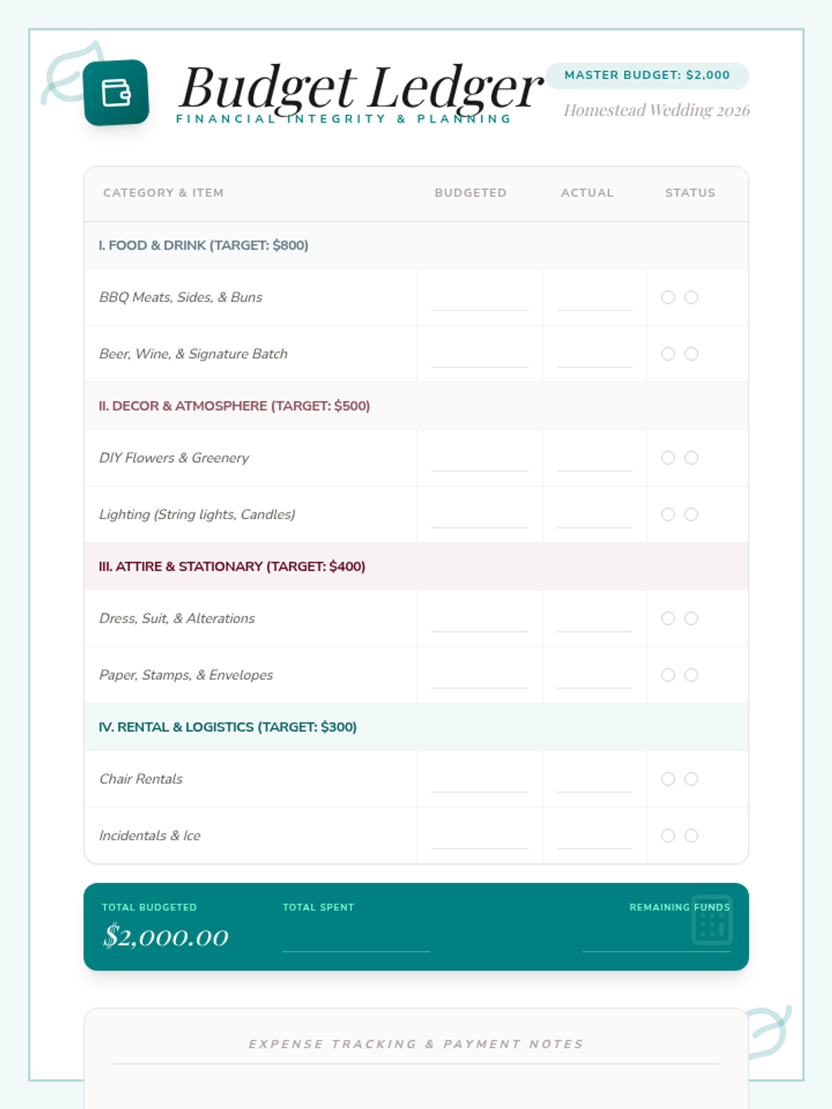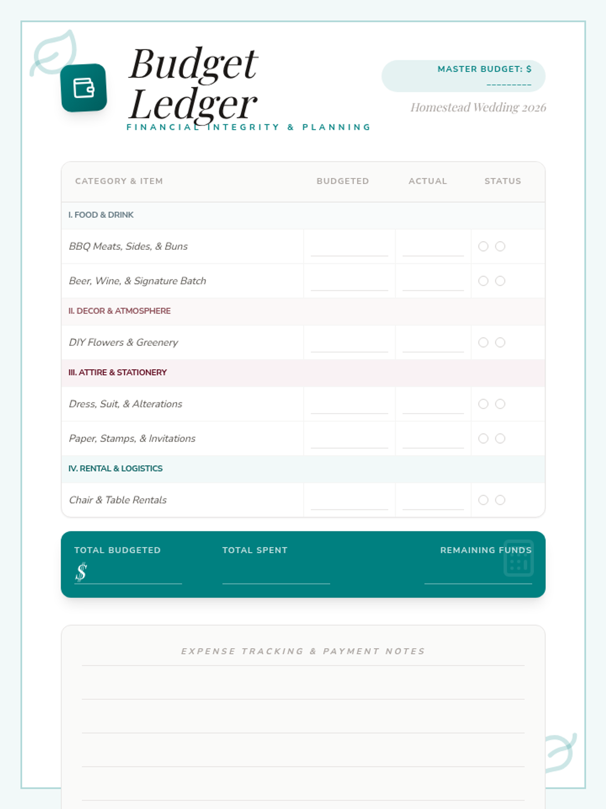 A premium, highly decorated budget ledger for a wedding planning binder. Features ornate borders, category-specific color accents (Teal, Burgundy, Rose Gold, Dusty Blue), and structured areas for budgeting, tracking actual costs, and payment status. Redesigned with a sophisticated farmhouse aesthetic. Corrected spelling and improved accessibility.
