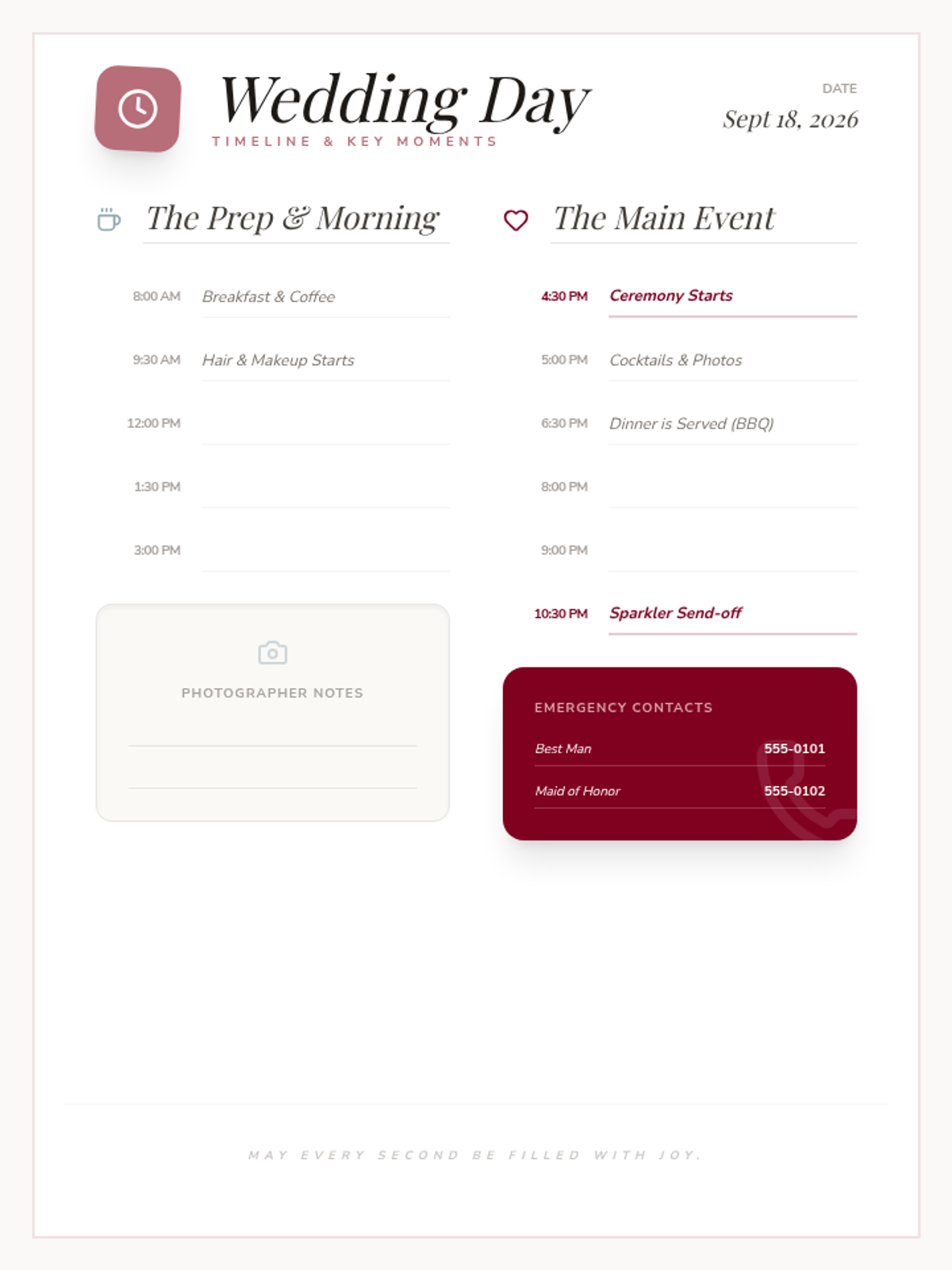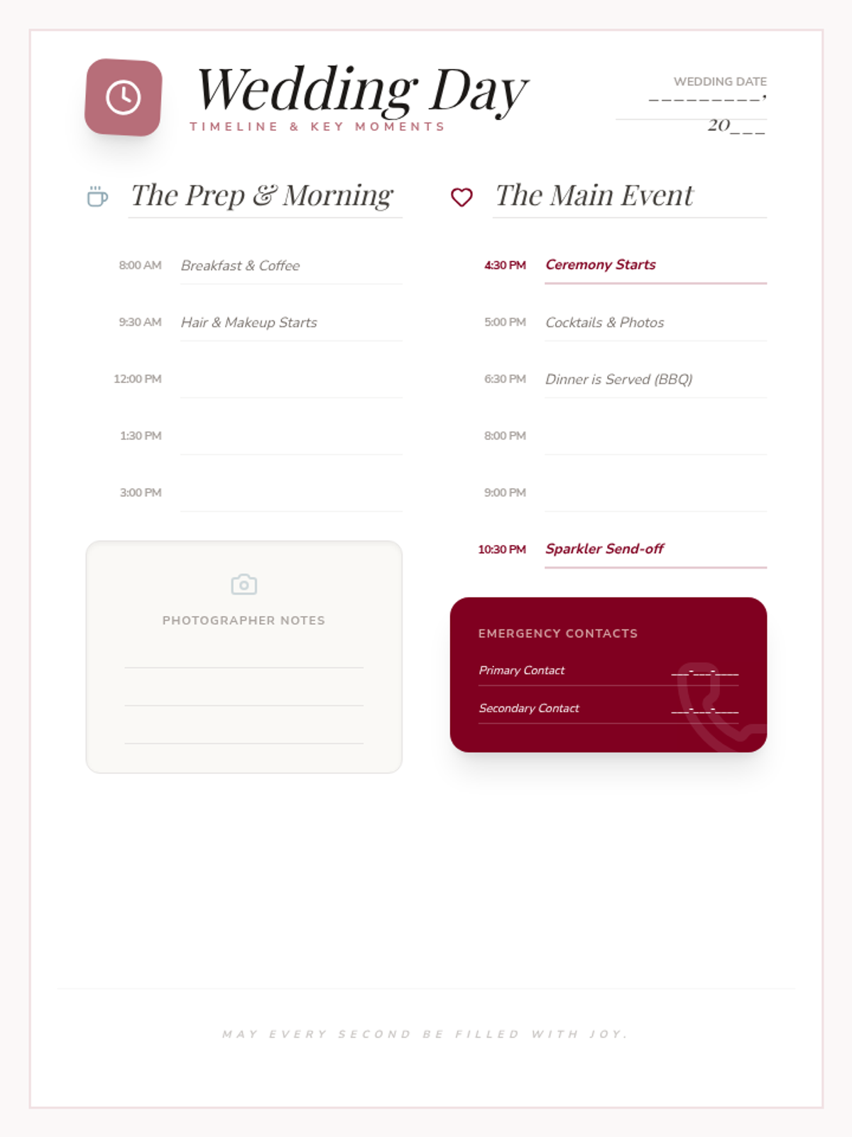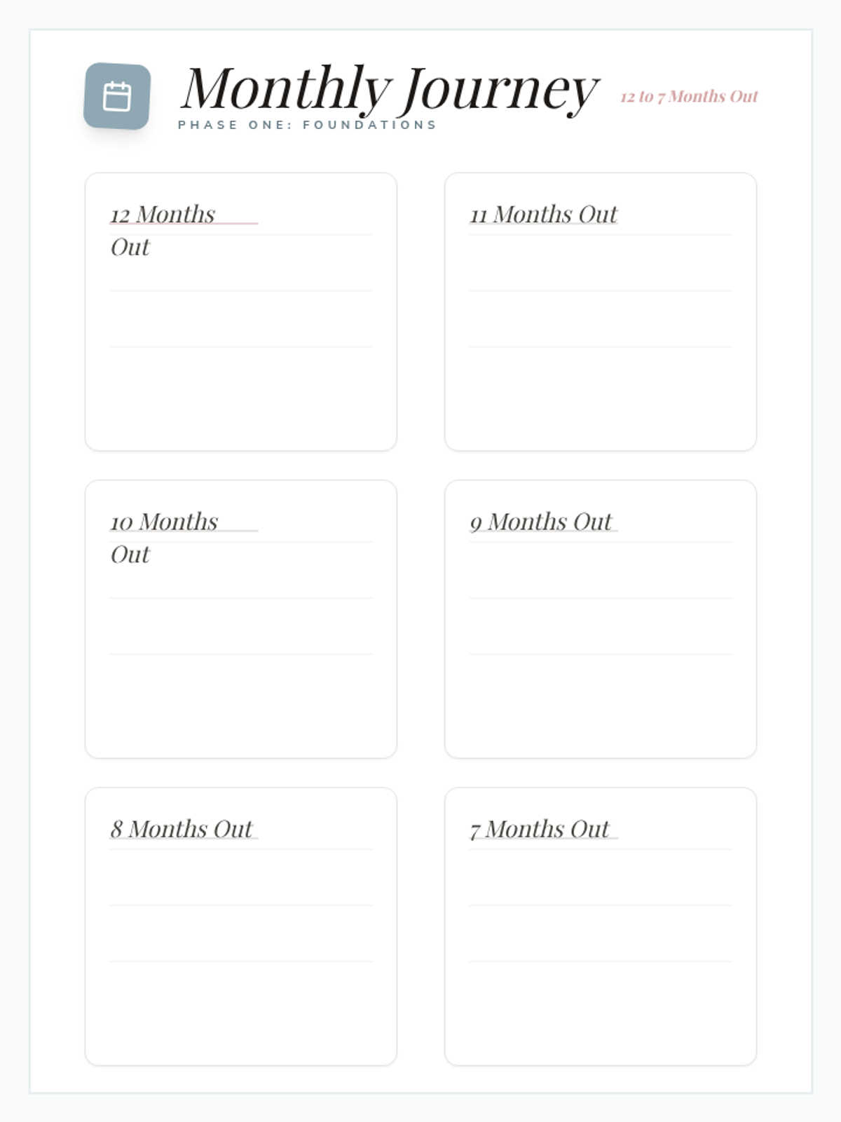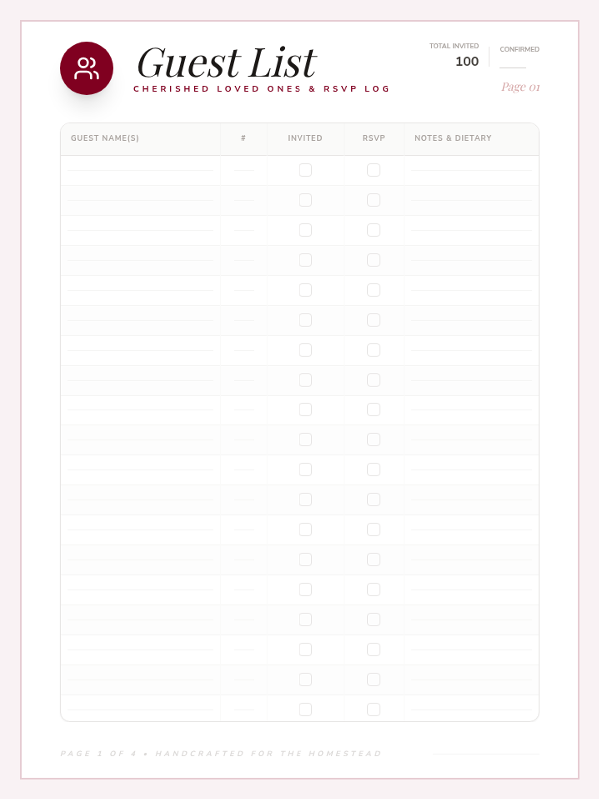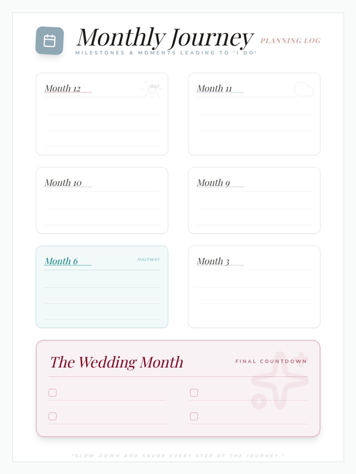 A premium, highly decorated budget ledger for a wedding planning binder. Features ornate borders, category-specific color accents (Teal, Burgundy, Rose Gold, Dusty Blue), and structured areas for budgeting, tracking actual costs, and payment status. Redesigned with a sophisticated farmhouse aesthetic. Corrected spelling and improved accessibility.