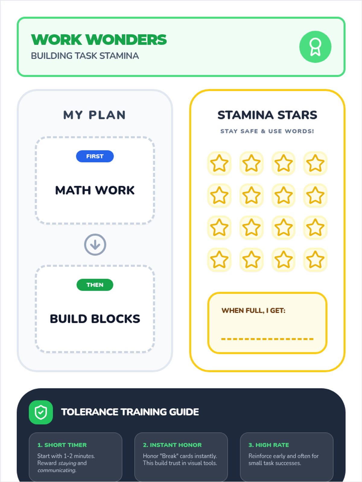 A 'First/Then' board and stamina tracking chart for Week 5, updated with higher contrast placeholder text, a refined layout that keeps teacher strategies on the same page, and a cleaner stamina star grid. Content sizing adjusted for 1st-grade readability.