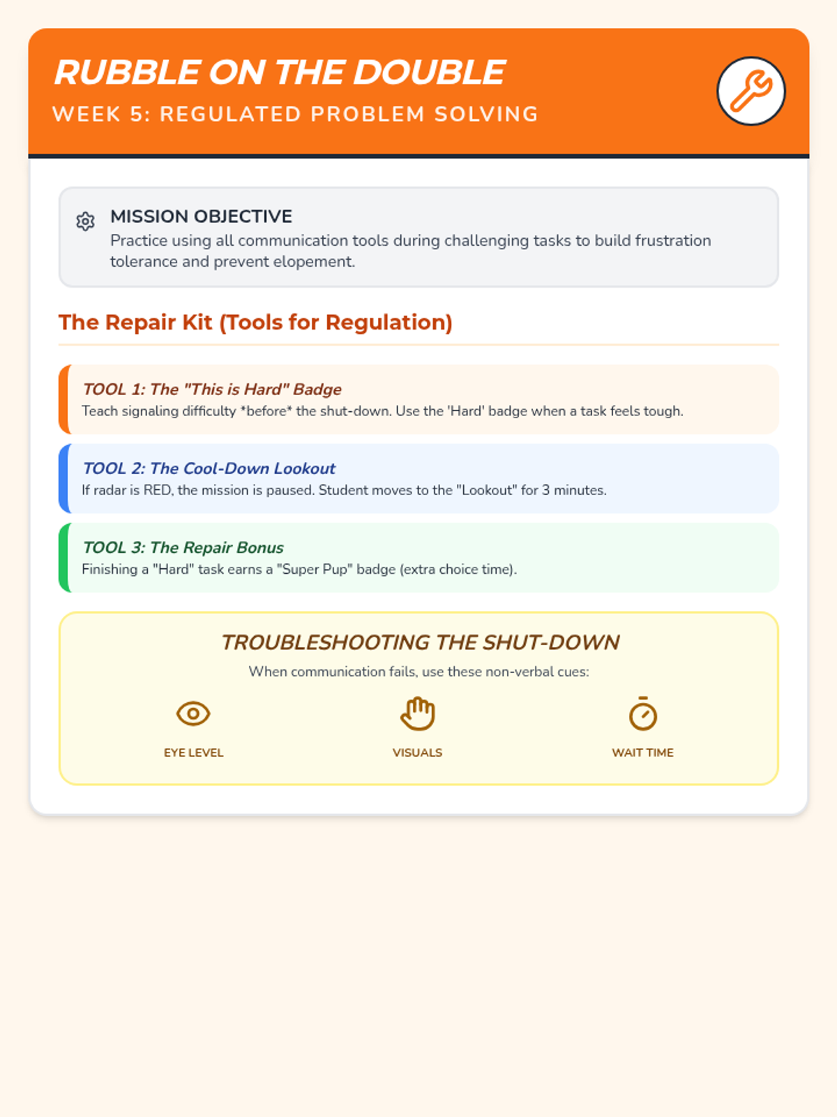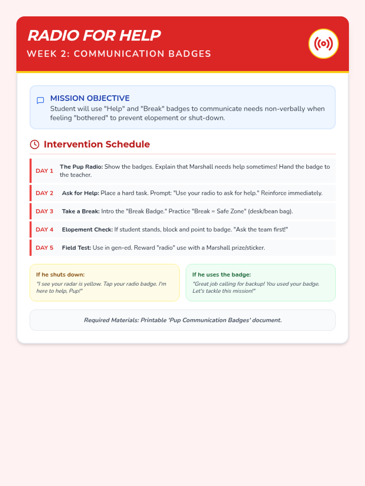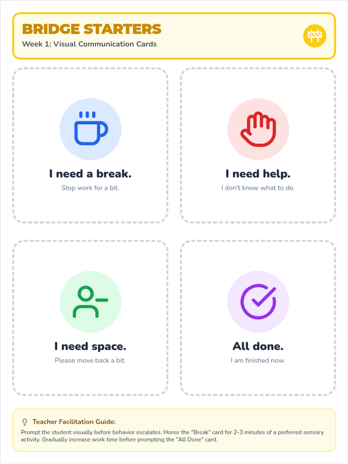 A set of visual functional communication cards and a teacher facilitation guide for Week 1, focusing on teaching 'Break' and 'Help' requests to replace task avoidance. Improved icon clarity and page layout for print.