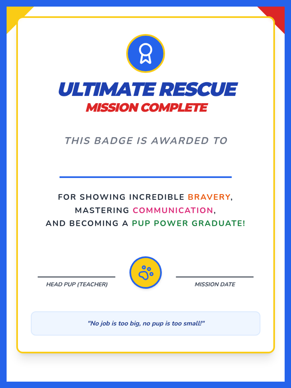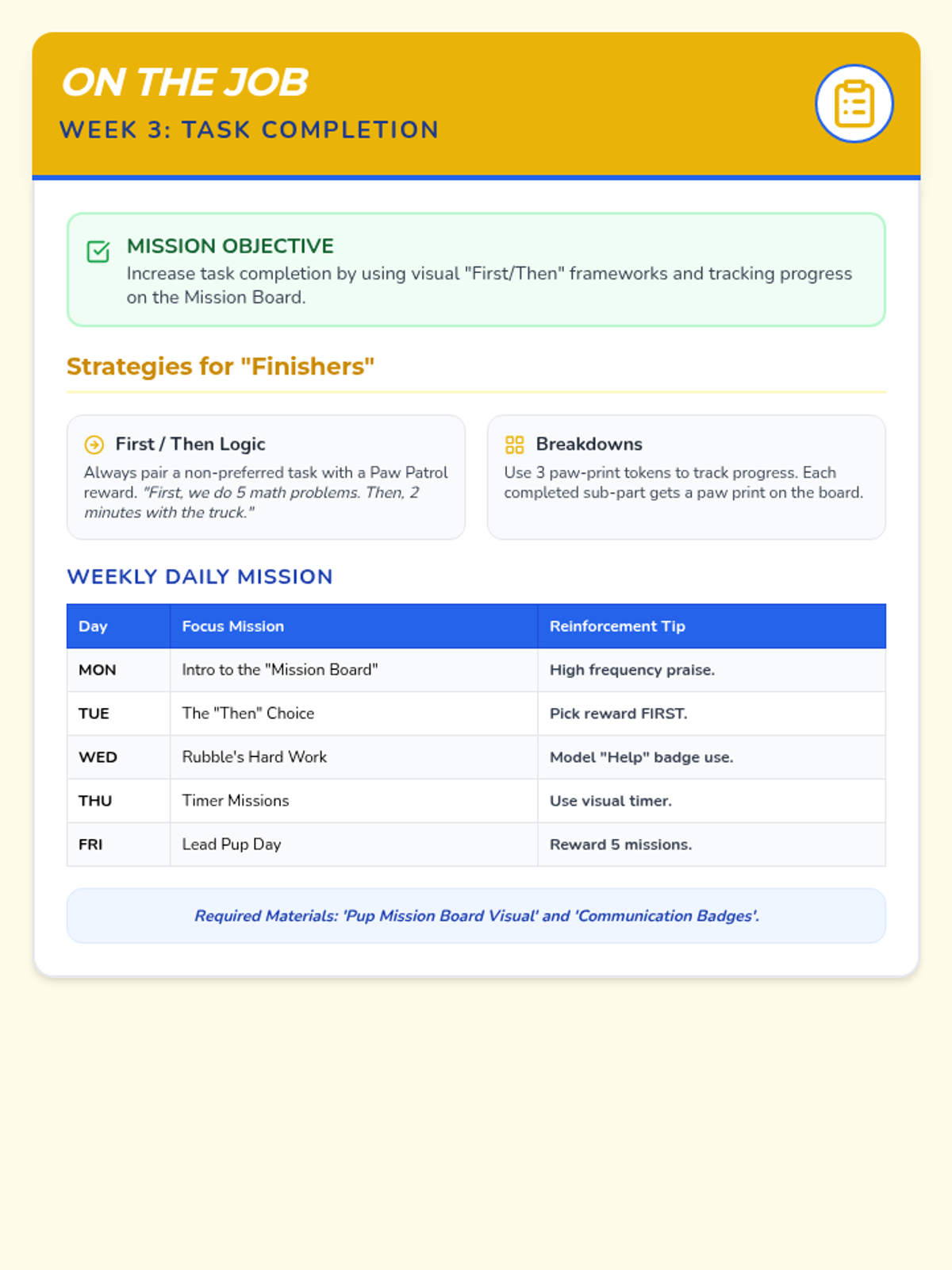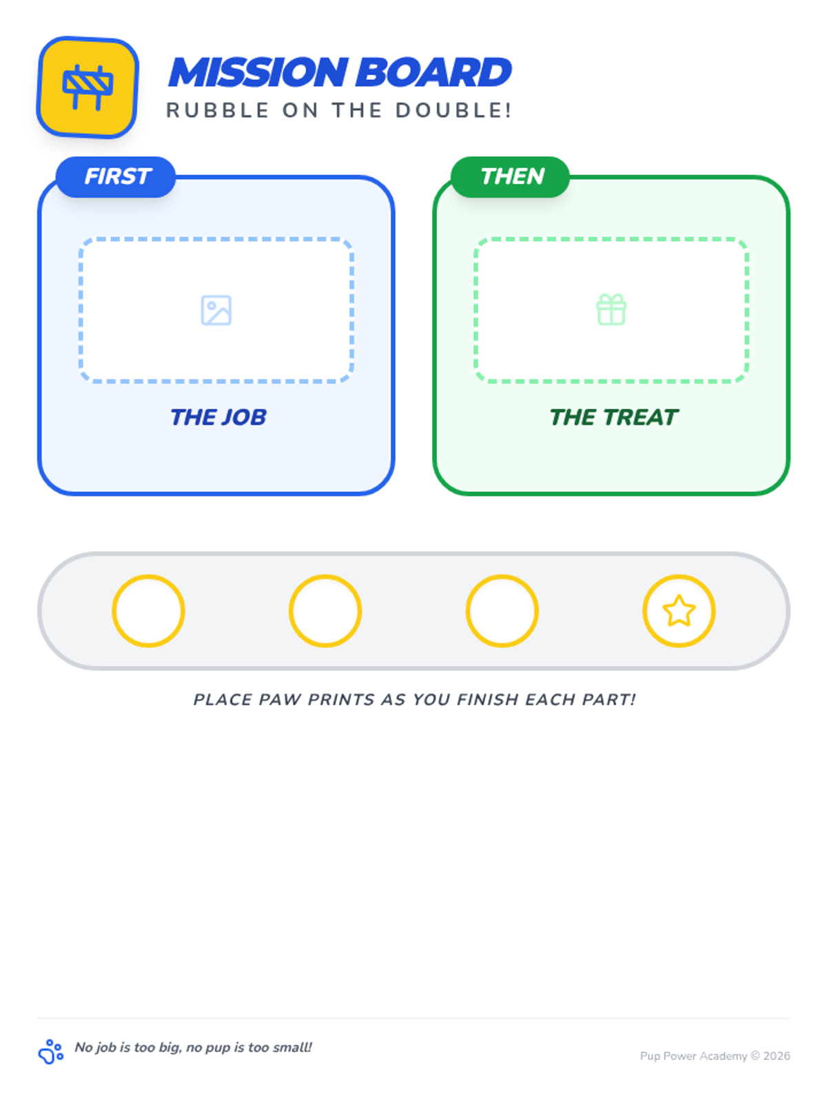Mission Board visual with placeholders removed. Added a second page with cut-out paw print tokens as requested.