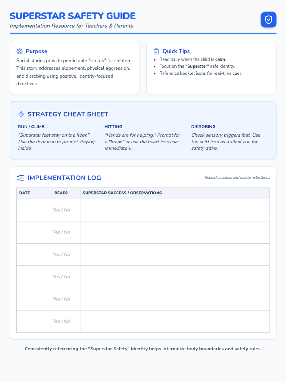An instructional guide for teachers and parents on how to effectively implement the Superstar Safety social story with young children, including troubleshooting tips for specific behaviors.