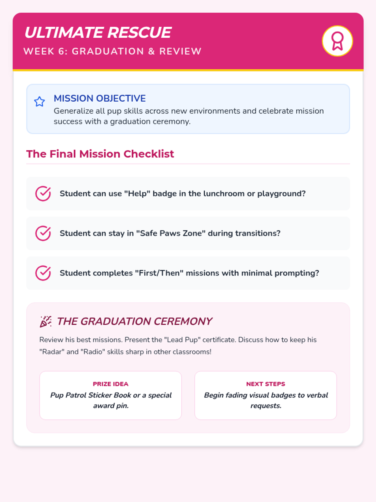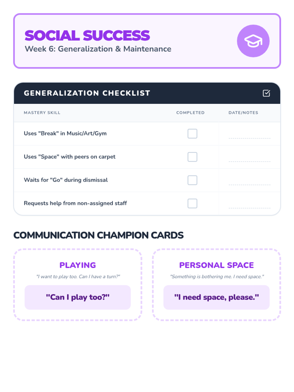 A generalization checklist, peer prompt cards, and an achievement certificate for Week 6, updated with a better tracking table, reinforced layout to prevent card splitting, and a larger, centered achievement certificate.