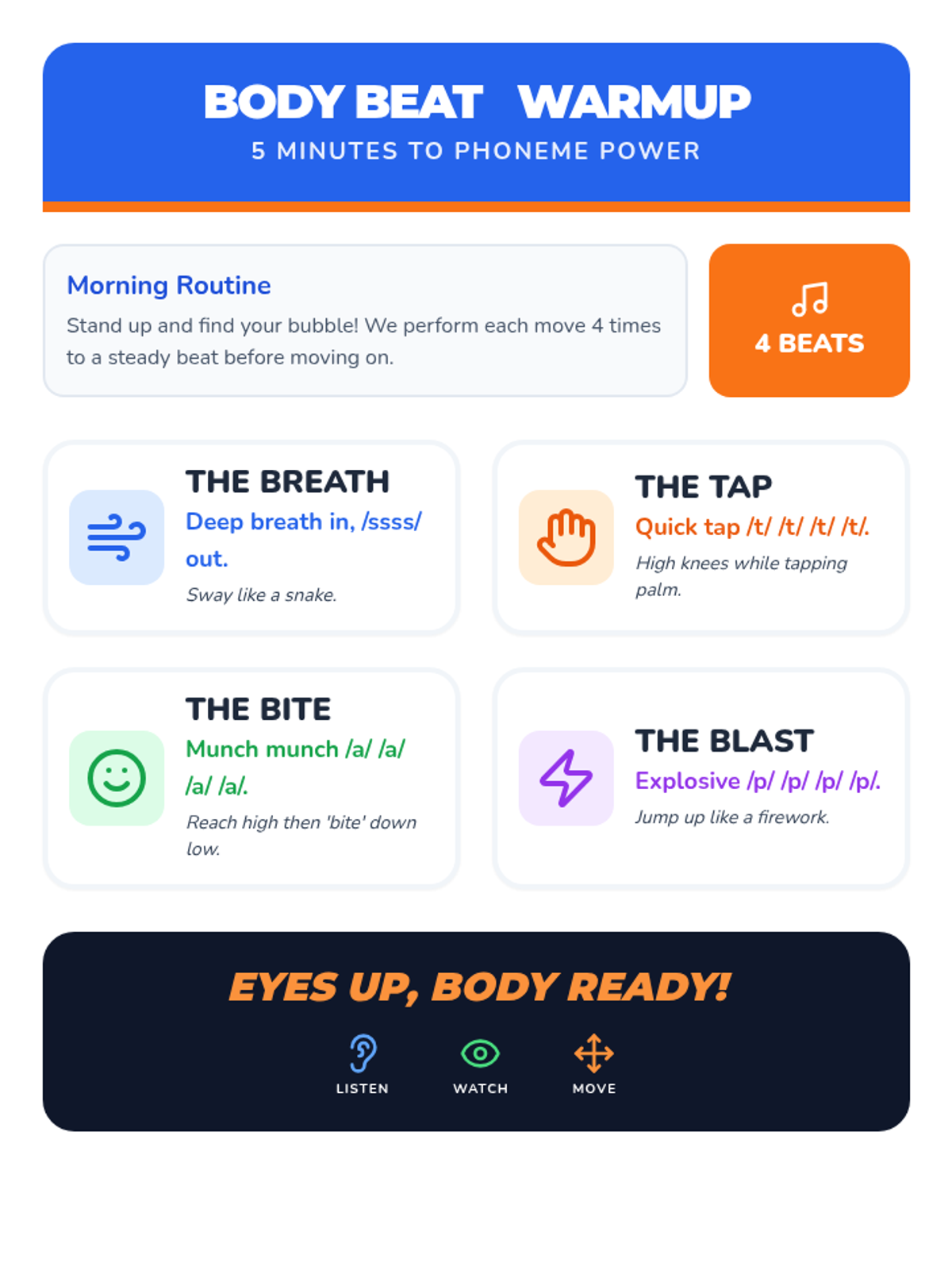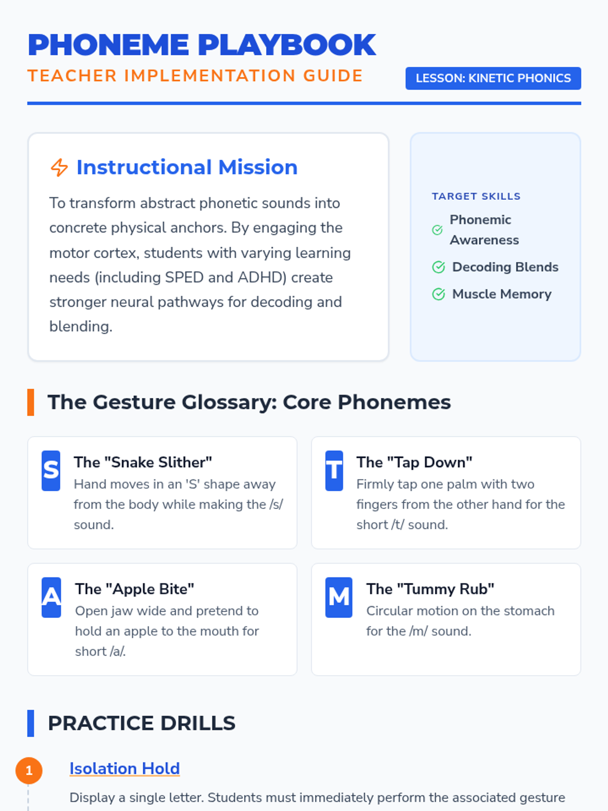 A quick-start visual reference guide for students to perform the daily kinetic phonics routine and build muscle memory.