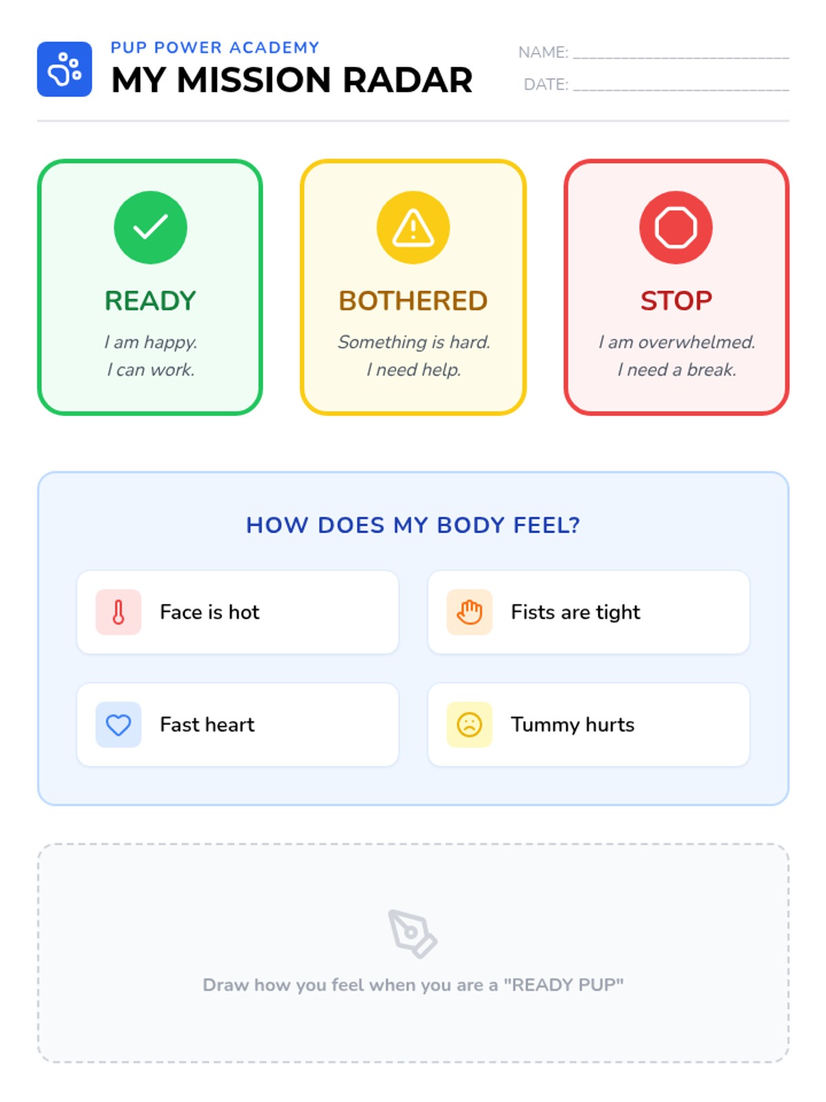 Student visual aid for Week 1, featuring a color-coded 'Mission Radar' to help identify feelings and physical symptoms of stress.