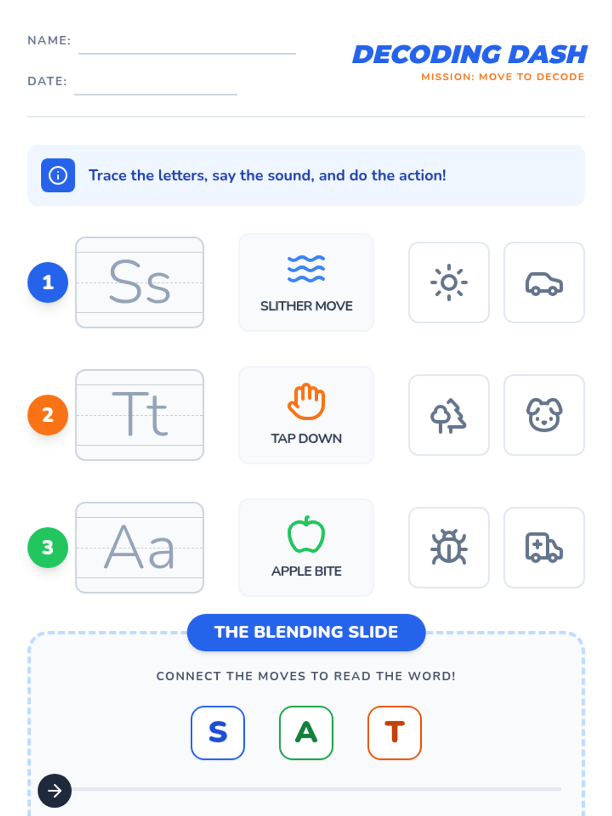 A hands-on worksheet where students practice tracing letters, identifying starting sounds, and performing kinetic gestures for phonemes.