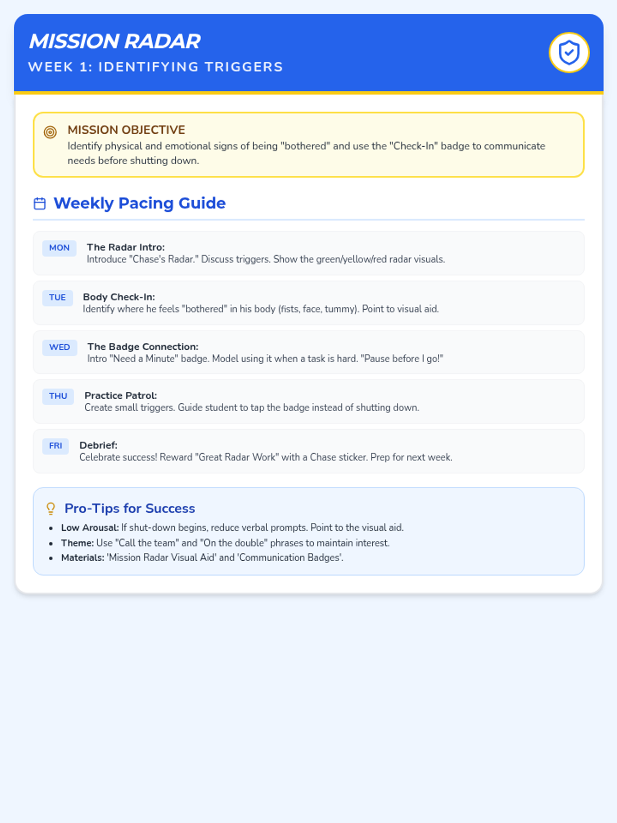 Teacher-facing lesson plan for Week 1, focusing on identifying emotional triggers using the 'Mission Radar' concept. Spacing updated for 1-page fit.