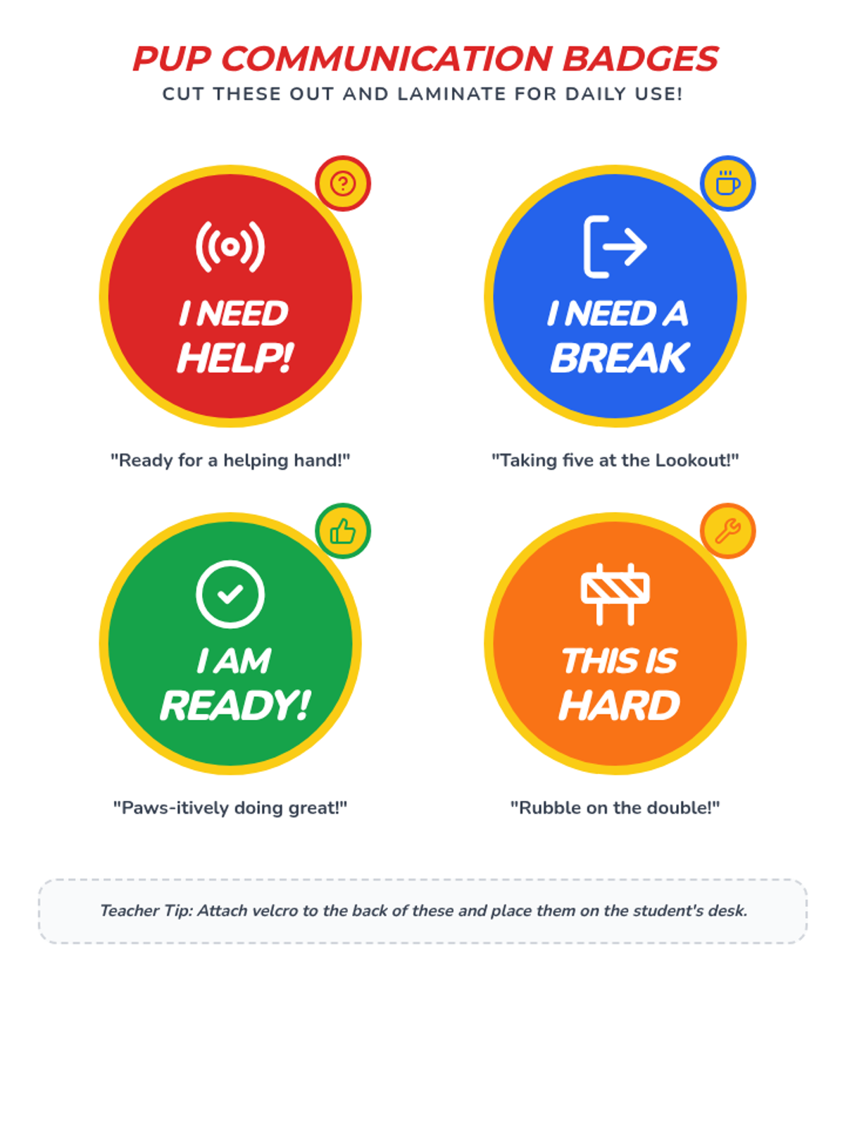 Printable non-verbal communication badges. Contrast improved and page breaks fixed.