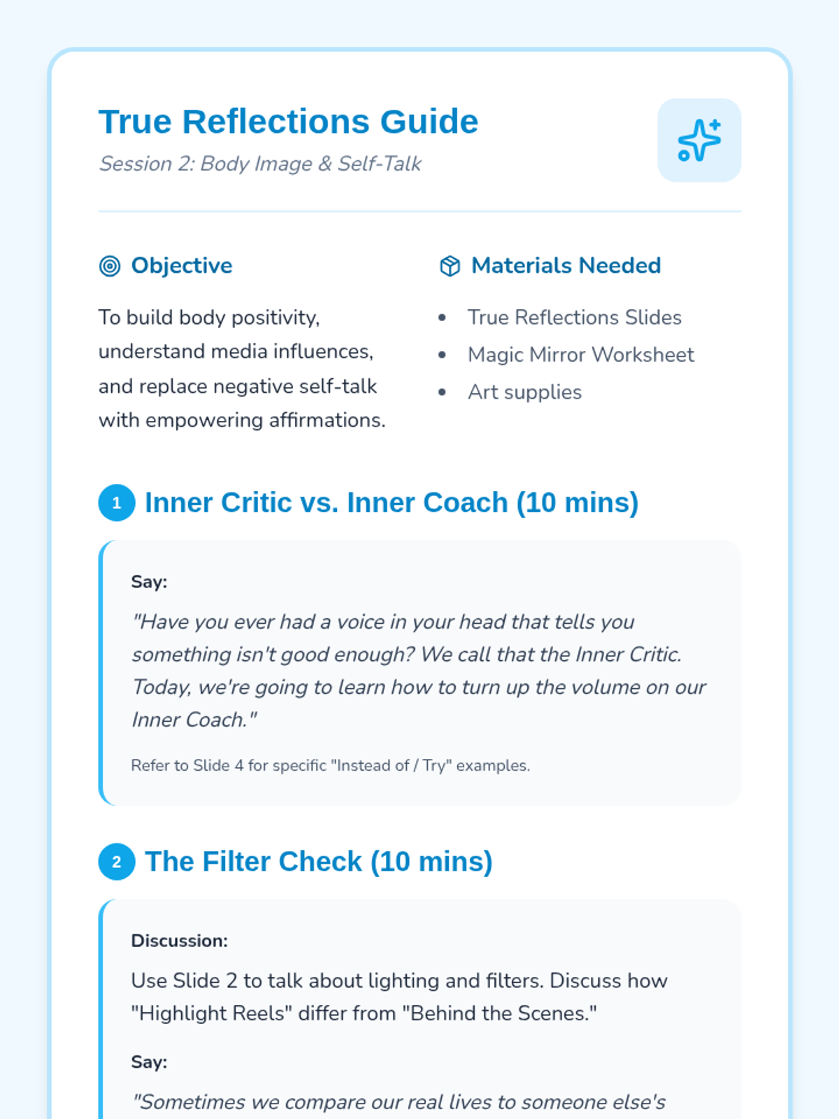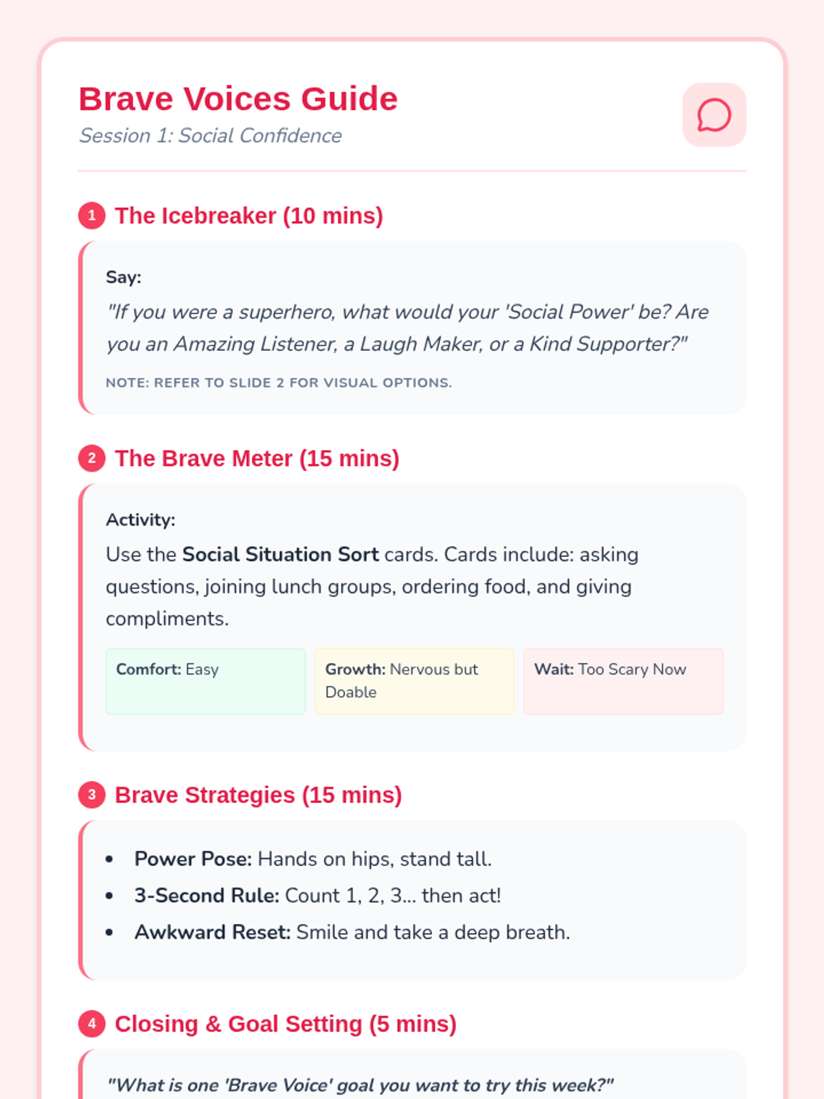 A teacher facilitation guide for implementing the Goal Getter Weekly Check-in, providing instructional routines, goal examples, and strategy-focused discussion prompts. It clearly defines the 0-10 frequency metric and provides a tiered interpretation for teachers.