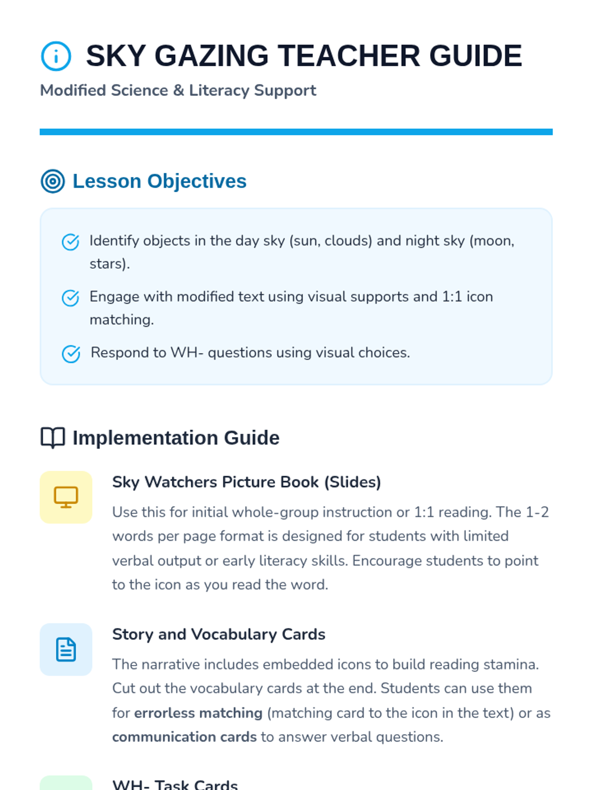 A student-facing visual sensory choice board designed as a professional classroom resource. Features "Power Up," "Power Down," and "Strong Body" categories with clear icons and teacher implementation tips. Page 2 includes color-coded implementation fields for clarity.