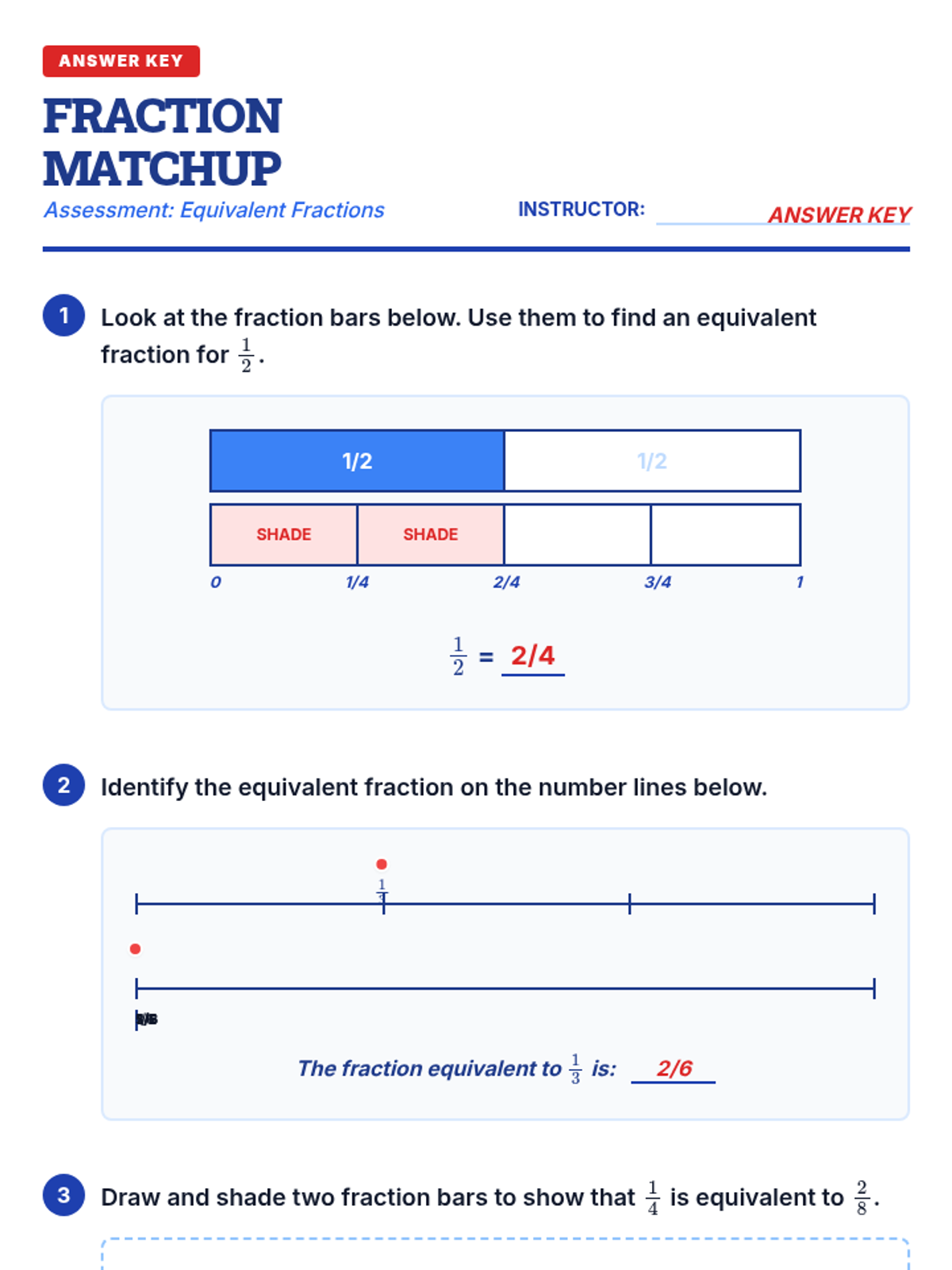 Answer key for the Fraction Matchup assessment, including visual guides and sample written responses.