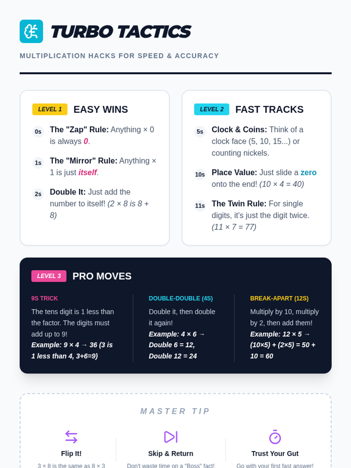 A student-facing reference sheet with multiplication strategies and mental math "hacks" for facts up to 12. Designed with an arcade-inspired Level Up theme to match the lesson's high-energy aesthetic.