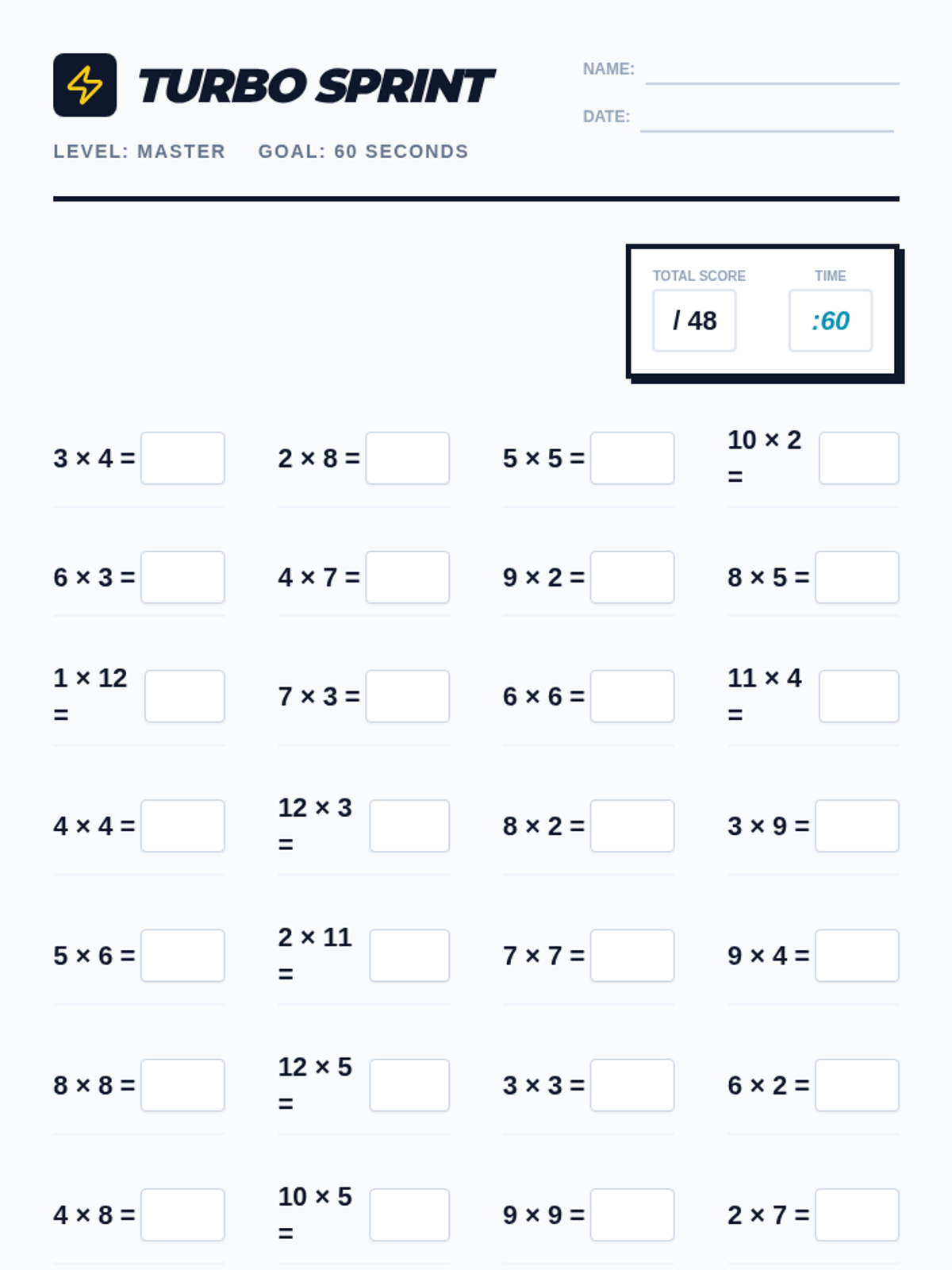 A high-energy, timed multiplication sprint worksheet featuring 48 problems up to 12x12. Designed for a 60-second challenge with a clean arcade-inspired aesthetic.