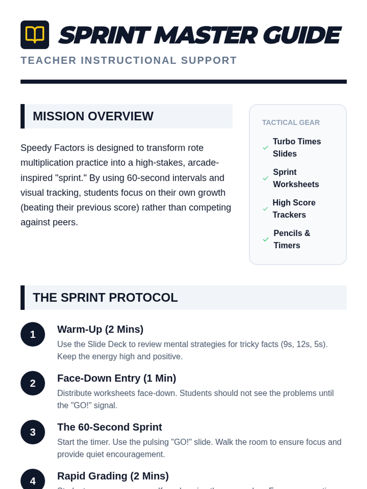 A teacher-facing lesson plan and instructional guide for implementing multiplication sprints. Includes pacing, procedures, and differentiation strategies.