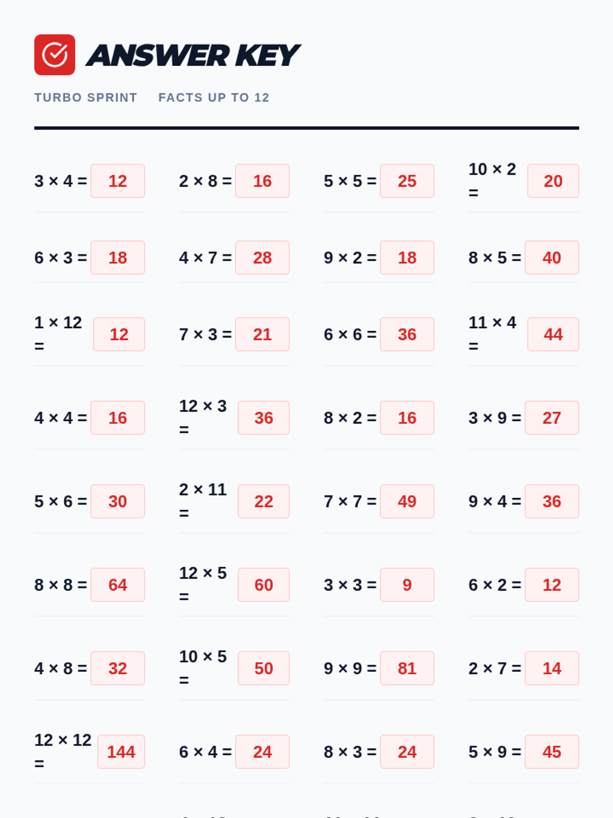 A teacher-facing answer key for the Turbo Sprint Worksheet, featuring all 48 multiplication solutions in a matching layout for rapid grading.